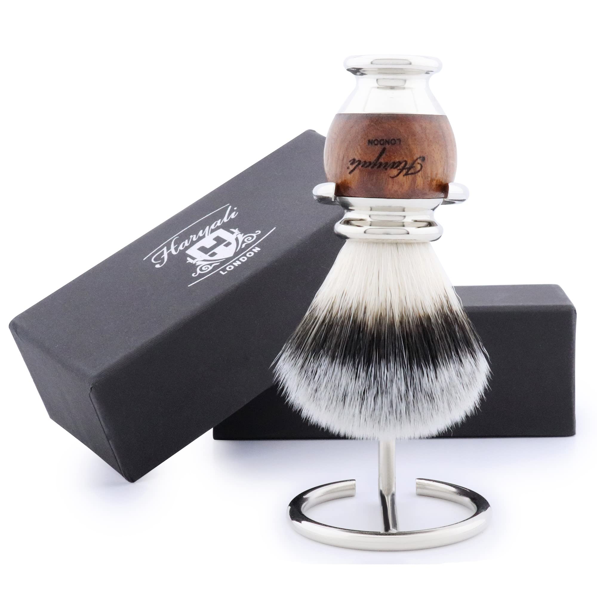 Haryali London Rasierpinsel - Nachhaltiges Rasierpinsel-Set - Synthetische Silvertip Rasierpinsel - Edelstahl Rasierständer - Holz- und Stahlgriff Rasierpinsel für Damen und Herren