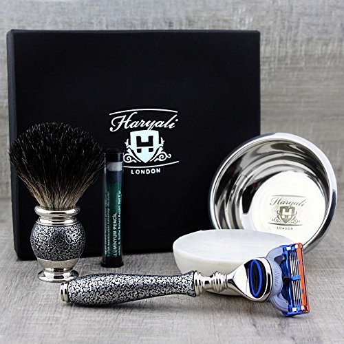 The shaving set consists of: * 1 x razor * 1 x razor brush * 1 x razor shell * 1 x soap * 1 x free aluminum stick Shave: If it is a close but very comfortable shave you are looking for, no further search for this razor, easily available sounds that are freely and smooth on the face, this razor has been developed to offer optimal balance while convenientlies in the hand.Extraordinary for wet shaving Specifications: * ? Material: metal * ? Cartridge: 3 edge * ? Length: 15cm * ? Weight: 75g * ? Color: silver Pure roof hair suitable for wet razors who like to treat themselves to a facial massage. The brushes are incredibly soft, fine and flexible and make your skin supple and gentle. The thawing is quick and easy to handle in Great Britain: Razor brushes are shaped by Haryali London in Great Britain and hand -shaped. We take time to ensure that every brush is brought to perfection. * ? Height: 10 cm * ? hair length: 5cm * ? handle height: 5cm * ? brush node: 22mm * ? hair class: pure roof hair - black * ? grip material: metal Stainless steel razor shell * shaving bowl is both smart and functional and ensures a great design. * The chic bowl is perfect for every modern bathroom. * Can be used with shaving soaps or creams to obtain a rich, rich shaving foam. * The ideal accessories for your wet shaving. * Made from high -quality German stainless steel, it is robust and resistant to rust. * Engraved Haryali London logo, an elegant detail in a simple design. * Highly polished stainless steel Comes in Haryali London Designer Box Free Alum Stick - so you are always safe and perfectly maintained, even if your hand slips.Our premium razor soap will form a great and moisturizing soap that ensures an extremely comfortable and luxurious shave.Suitable for all types of skin, your face is protected and safe from the aggressive nature of shaving.Designed, created and branded by Haryali London, a guarantee of authenticity and a trusted partner.Offers a gentle face massage and skin peeling for an extraordinary razor experience.Pure degree roof hair shaving brush, handmade and carefully selected.Incredibly soft and flexible for a gentle and gentle experience.The perfect water intake guarantees a quick and simple foam. Das Rasierset besteht aus: * 1 x Rasierer * 1 x Rasierpinsel * 1 x Rasierschale * 1 x Seife * 1 x GRATIS ALUM STICK Rasierer:Wenn es eine nahe, aber sehr komfortable Rasur ist, die Sie suchen, suchen Sie nicht weiter Dieser Rasierer verwendet leicht verfügbare Klingen, die frei und glatt auf dem Gesicht sind Dieser Rasierer wurde entwickelt, um optimale Balance zu bieten, während er bequem in der Hand liegt. Außergewöhnlich für Nassrasur Spezifikationen: * ?Material: Metall * ?Cartridge: 3 Kante * ?Länge:15cm * ?Gewicht: 75g * ?Farbe: Silber REINES DACHSHAARGeeignet für Nassrasierer, die sich gerne eine Gesichtsmassage gönnen. Die Bürsten sind unglaublich weich, fein und flexibel und machen Ihre Haut geschmeidig und sanft. Das Auftauen ist schnell und einfach Handgefertigt in Großbritannien: Rasierpinsel werden von Haryali London in Großbritannien geformt und handgeformt Wir nehmen uns Zeit um sicherzustellen, dass jeder Pinsel zur Perfektion gebracht wird. * ? Höhe: 10 cm * ? Haarlänge: 5cm * ? Griffhöhe: 5cm * ?Pinselknoten: 22mm * ? Haarklasse: Reines Dachshaar - schwarz * ? Griffmaterial: Metall Edelstahl-Rasierschale * Rasierschale ist sowohl schlau als auch funktional und sorgt für ein tolles Design. * Die schicke Schale ist perfekt für jedes moderne Badezimmer. * Kann mit Rasierseifen oder -cremes verwendet werden, um einen reichhaltigen, reichhaltigen Rasierschaum zu erhalten. * Das ideale Zubehör für Ihre Nassrasur. * Hergestellt aus hochwertigem deutschem Edelstahl, ist er robust und widerstandsfähig gegen Rost. * Graviertes Haryali London Logo, ein elegantes Detail in einem schlichten Design. * Hochglanzpolierter Edelstahl Kommt in Haryali London Designer BoxGratis Alum Stick - so sind Sie immer sicher und perfekt gepflegt, auch wenn Ihre Hand rutscht. Unsere Premium-Rasierseife wird eine großartige und feuchtigkeitsspendende Seife bilden, die eine äußerst komfortable und luxuriöse Rasur gewährleistet. Geeignet für alle Arten von Haut, wird Ihr Gesicht geschützt und sicher vor der aggressiven Natur der Rasur. Entworfen, kreiert und gebrandet von HARYALI LONDON, ein Garant für Authentizität und ein Trusted Partner. Bietet eine sanfte Gesichtsmassage und Hautpeeling für ein außergewöhnliches Rasiererlebnis. Pure Grade Dachshaar Rasierpinsel, handgefertigt und sorgfältig ausgewählt. Unglaublich weich und flexibel für ein sanftes und sanftes Erlebnis. Die perfekte Wasseraufnahme garantiert einen schnellen und einfachen Schaum.Haryali London Vintage Inspired Shaving Set - 4 Piece Pure Badger Hair Shaving Brush, Gillette Fusion Razor, Stainless Steel Shaving Bowl & Haryali London Premium Soap