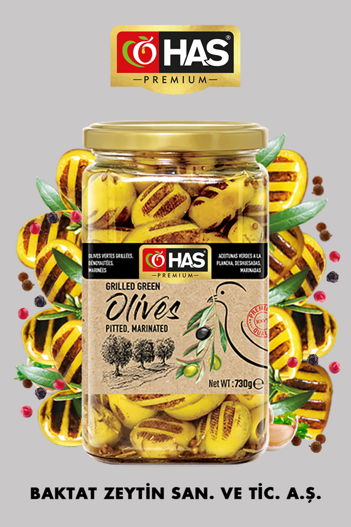 Has Premium Grilled Green Olives Pitted Marinated 850cc