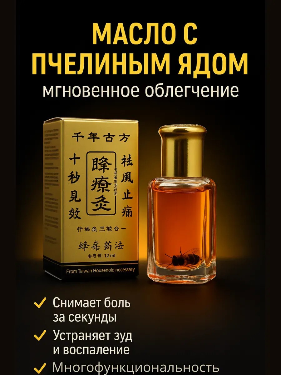 Масло с пчелиным ядом — многофункциональное средство для здоровья кожи и суставов. Оно помогает быстро снять боль и воспаление, облегчает дискомфорт после физических нагрузок и укусов насекомых. Благодаря натуральному составу (пчелиный яд и растительные экстракты) масло действует мягко, но эффективно, подходит для регулярного применения.