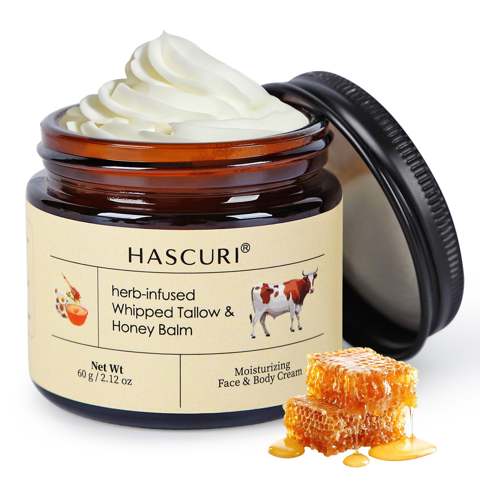 HASCURI Grass-Fed Whipped Tallow Balm - 100% Pure Beef Tallow Moisturizer for Face & Body - Rich in Vitamins E - Traditional Skin Food for Deep Hydration & Barrier Support - 2 oz (60g)