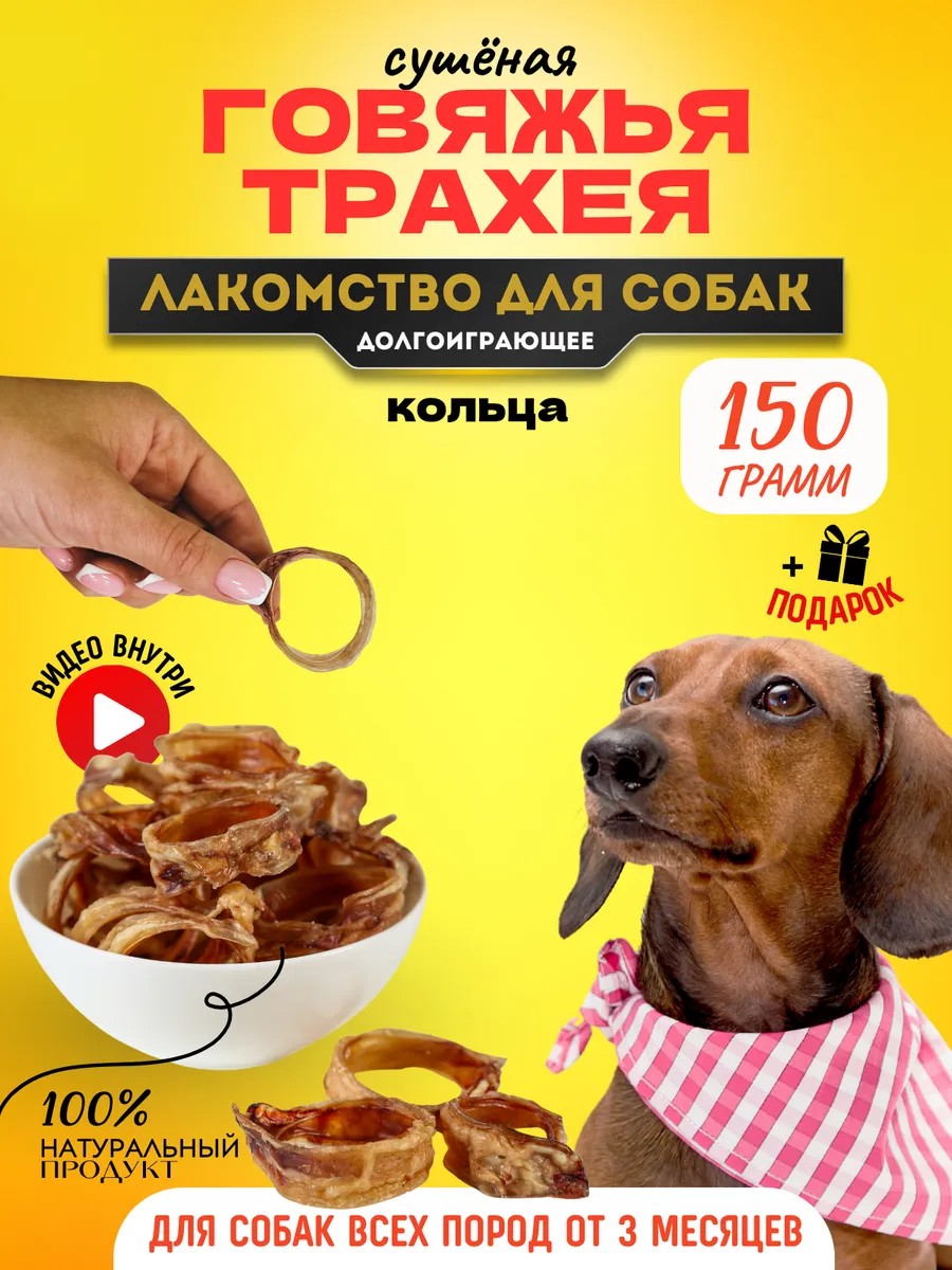 Говяжья трахея кольца шириной 1-2 см. В каждой упаковке ПОДАРОК! Трахея сушеная - это идеальное лакомство для собак, изготовленная из натурального говяжьего мяса. Кольца трахеи - настоящий деликатес, который необходимо включать в зооменю. Лакомства для дрессировки подходят для вознаграждения во время тренировок, прогулок, для отвлечения внимания.