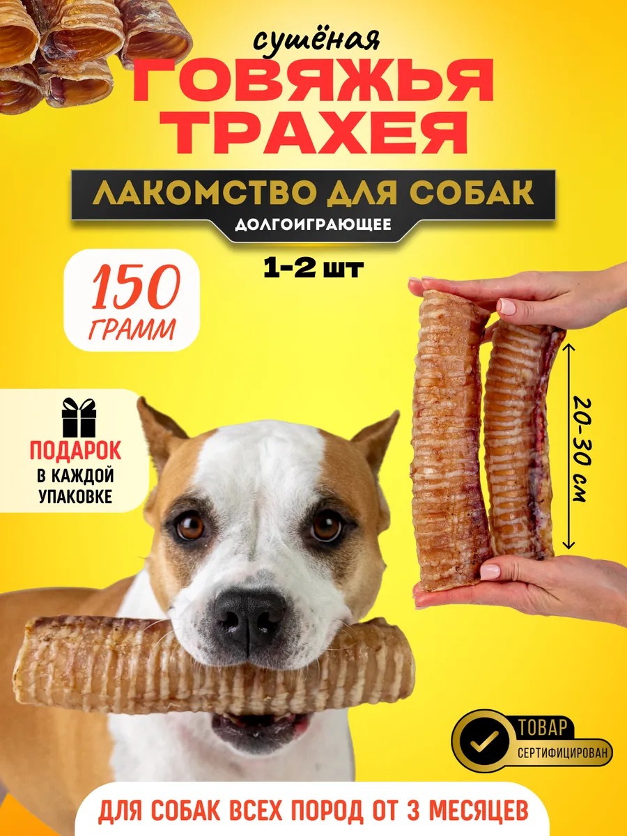 | Количество предметов в упаковке | говяжья трахея 150 г (1-2шт размером 20-30см) + подарок |