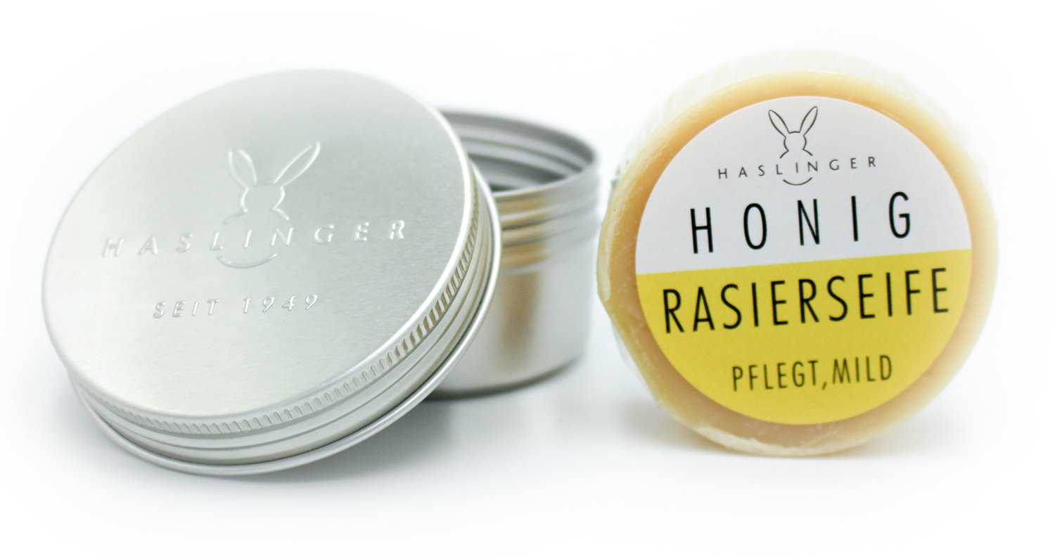 This shaving soap foams excellently and results in a creamy foam with good sliding properties - the best prerequisite for a pleasant and clean wet shaving.The mild and skin -friendly shaving soap, which was made on a pure vegetable oil, smells pleasantly of honey. Honey is particularly gentle on the skin, because the low-acid pH value is similar to that of the skin whose natural acid protection jacket is thus protected, and a loss of moisture is prevented.The elasticity and elasticity of the skin remain or are improved. And the antibacterial active ingredients in the honey have a skin -calming effect. Even through traditions from antiquity, honey stands for beautiful skin and well -being. Ingredients honey shaving soap: Potassium stearates, sodium stearate, potassium tallowate, aqua, mel, perfume, aroma, arachis hypogaea, potassium cocoate, sodium tallowate, sodium cocoate, glycerins, potassium hydroxides, sodium hydroxides, ci1985, cinnamyl alcohol, ATE, Bencylsalicylat, Citronellol English nameNew: in a practical aluminum socket.Quality from Austria - soap factory since 1890. On pure vegetable oil base, with the power of honey - healing, nourishing and moisturizing;Not tested on animals.Skin -friendly, suitable for every skin type.Mild nourishing shaving soap with pleasant fragrance, 60 grams. Diese Rasierseife schäumt hervorragend und ergibt einen sahnigen Schaum mit guten Gleiteigenschaften – beste Voraussetzung für eine angenehme und saubere Nassrasur. Dabei duftet die milde und hautfreundliche Rasierseife, die auf reiner Pflanzenölbasis hergestellt wurde, angenehm nach Honig. Honig ist besonders schonend zur Haut, denn der schwachsaure ph-Wert ähnelt dem der Haut, deren natürlicher Säureschutzmantel somit geschützt, und ein Feuchtigkeitsverlust verhindert wird. Elastizität und Spannkraft der Haut bleiben erhalten beziehungsweise werden verbessert. Und die antibakteriellen Wirkstoffe im Honig wirken hautberuhigend. Schon durch Überlieferungen aus der Antike steht Honig für schöne Haut und Wohlbefinden. Inhaltsstoffe Honig Rasierseife: potassium stearate, sodium stearate, potassium tallowate, aqua, mel, parfum, aroma, arachis hypogaea, potassium cocoate, sodium tallowate, sodium cocoate, glycerine, potassium hydroxide, sodium hydroxide, CI19140, CI15985, cinnamylalcohol, benzylbenzoate, bencylsalicylat, citronellolNEU: in einer praktischen Aluminiumdose. Qualität aus Österreich - Seifenfabrik seit 1890. auf reiner Pflanzenölbasis, mit der Kraft von Honig - heilend, pflegend und feuchtigkeitsspendend; tierversuchsfrei. hautfreundlich, für jeden Hauttyp geeignet. mild pflegende Rasierseife mit angenehmen Duft, 60 Gramm.Haslinger Rasierseife Honig ca. 60g in Dose