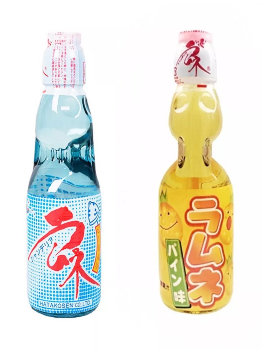 Напиток газированный Рамунэ «Классический вкус», 200 мл и Напиток газированный Рамунэ со вкусом ананаса, 200 мл. Рамунэ - японский газированный безалкогольный напиток. Слово имеет связь со словом "lemonade". Ramune - это лимонад в специальной бутылке. Основная "фишка" этих бутылок, вызвавшая дикий интерес у американцев и европейцев, заключается в стеклянном шарике, заменяющем пробку. Чтобы отведать напиток, пробку выталкивают внутрь. Поэтому пить напиток непривычно, так как стеклянный шарик загораживает горлышко. Причем пластиковая крышка, которая прилегает к самой бутылке, не дает возможности достать шарик из упаковки.
