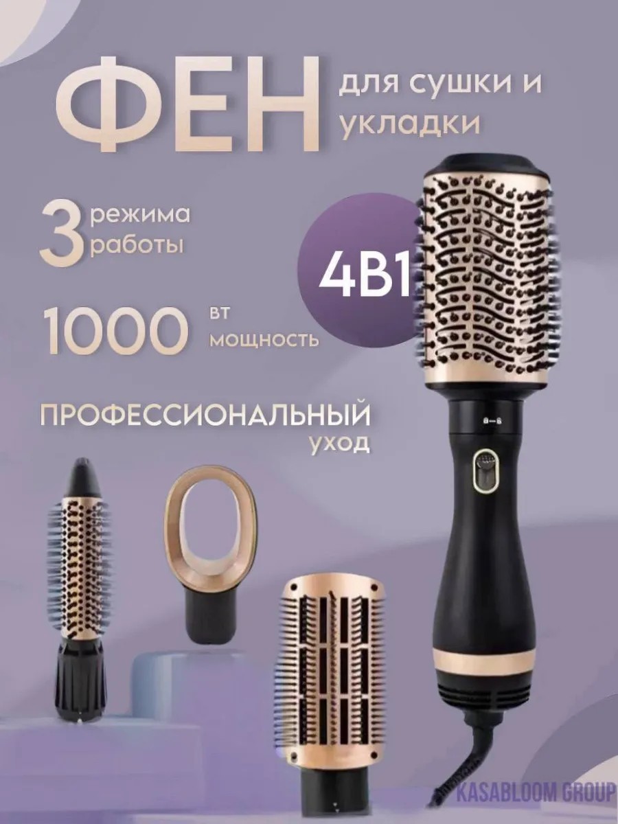 Фен-щетка 4 в 1 — универсальное устройство для укладки волос, совмещающее функции фена, щетки, выпрямителя и объемной укладки. Обладает несколькими насадками для различных стилей укладки, регулируемыми режимами температуры и скорости, что позволяет быстро и эффективно сушить и укладывать волосы, придавая им блеск и объем. Идеально подходит для использования в домашних условиях.