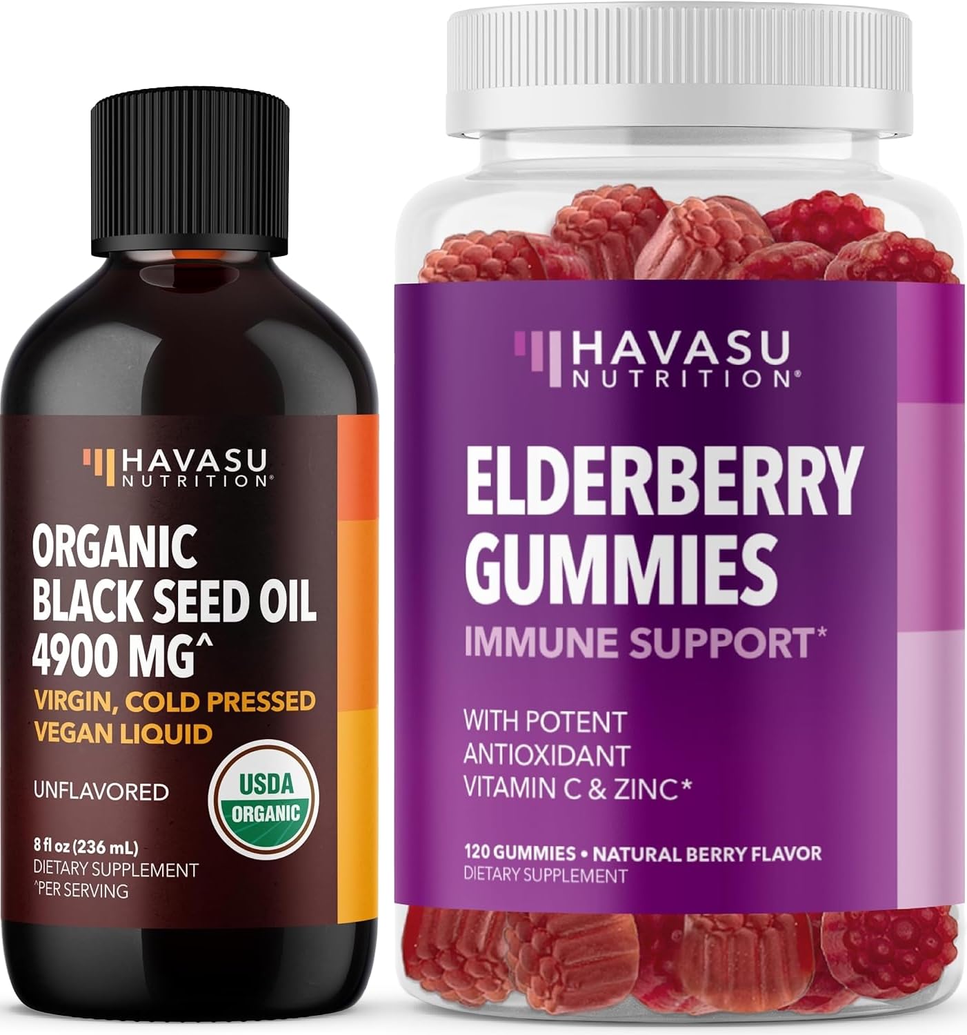 HAVASU NUTRITION Black Seed Oil Organic Cold Pressed Liquid (8 Fl Oz) & Black Elderberry Gummies with Zinc and Vitamin C (60 Servings)