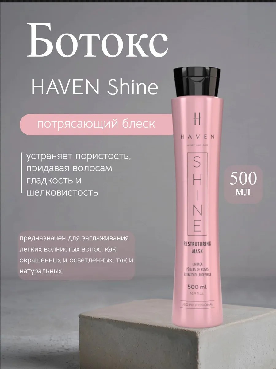 HAVEN Shine это профессиональный ботокс, предназначенный для заглаживания легких волнистых волос, как окрашенных и осветленных, так и натуральных. Его формула обогащена экстрактами зеленого чая, алоэ вера, семян льна и розы, что обеспечивает глубокое питание локонов и восстанавливает их эластичность, мягкость и потрясающий блеск. Препарат устраняет пористость, придавая волосам гладкость и шелковистость. Эффект сохраняется от 3 до 5 месяцев.