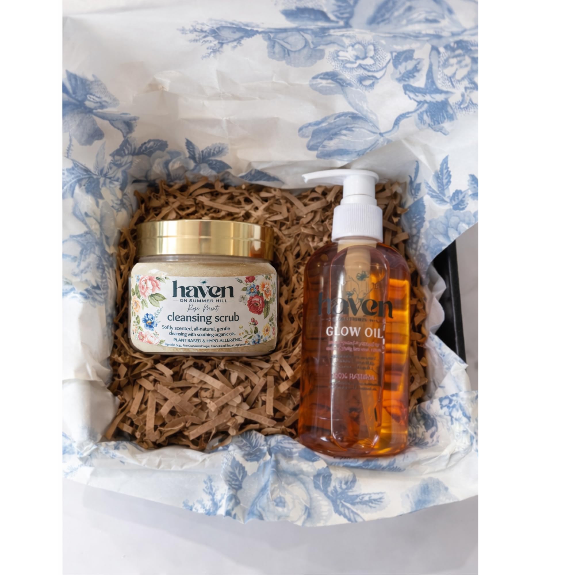 Haven Blue All Natural Gift Bundle Set – Rose Mint Sugar Scrub Vitamin E Glow Oil (8 oz Each) 100 Natural Ingredients Thoughtfully Curated Gift Set Treat yourself or someone special to the Haven Blue All Natural Gift Bundle Set, featuring two of our best-selling skincare essentials: Rose Mint All Natural Sugar Scrub (8 oz) Signature Vitamin E Glow Oil (8 oz) Both products come in reusable, BPA-free plastic pump bottles and are beautifully presented in a Haven signature black folding gift box with floral Haven blue tissue paper—carefully arranged for an elevated, ready-to-gift experience. Rose Mint All Natural Sugar Scrub – Gentle Cleansing Exfoliation This luxurious, all-natural sugar scrub gently cleanses and exfoliates to help remove dull, dry skin, leaving skin feeling soft, smooth, and refreshed. The creamy texture and fine granulated sugar provide a soothing exfoliation experience suitable for regular use. Key Features: Gently exfoliates dead skin cells Helps improve skin's softness and smooth appearance Lightly cleanses without harsh ingredients Relaxing Rose Mint aroma Made with thoughtfully selected ingredients: Apricot Oil Vitamin E Oil Jojoba Oil Castile Soap Pure Granulated Sugar Signature Vitamin E Glow Oil – Lightweight, Multi-Purpose Hydration Haven's All Natural Glow Oil is a lightweight, fast-absorbing blend designed for daily skincare and hair care. Rich in pure Vitamin E and nourishing plant oils, it helps moisturize, soften, and enhance skin's natural radiance without feeling greasy. Plant-Based Oil Blend Includes: Apricot Oil – Helps soothe and soften the skin Coconut Oil – Provides lasting moisture Sunflower Oil – Helps support moisture retention Jojoba Oil – Absorbs easily and helps balance skin Use on the face, neck, chest, body, or hair ends for added hydration and shine. Light essential oils provide a subtle, calming scent. Clean Beauty You Can Feel Good About 100 Natural Ingredients Vegan Cruelty-Free No harsh synthetic chemicals Reusable pump-top bottles Made and packaged with care Perfect for birthdays, holidays, thank-you gifts, self-care moments, or "just because."Vegan, Cruelty-Free Clean – Free from harsh synthetic chemicals, safe for daily use, and packaged thoughtfully for a luxury, ready-to-gift experience. Ideal for birthdays, holidays, or self-care moments. Relaxing, Natural Scents – Infused with a subtle Rose Mint aroma and delicate essential oils for a calming sensory experience, perfect for at-home spa treatments or gifting. Multi-Purpose Glow Oil – Our lightweight Vitamin E Glow Oil nourishes and hydrates skin, face, and hair. Formulated with Apricot, Coconut, Sunflower, and Jojoba Oils, it absorbs quickly for soft, healthy-looking skin and smooth, shiny hair ends. Gentle Exfoliation Cleansing – The Rose Mint Sugar Scrub naturally removes dead skin cells while softening and smoothing skin, leaving a refreshed, radiant feel. Enriched with Apricot, Jojoba, and Vitamin E Oils for a soothing, non-drying experience. All Natural Skincare Gift Set – Includes our best-selling Rose Mint Sugar Scrub (8 oz) and Vitamin E Glow Oil (8 oz) in reusable, BPA-free pump bottles, elegantly packaged in a Haven signature black gift box with floral blue tissue paper.