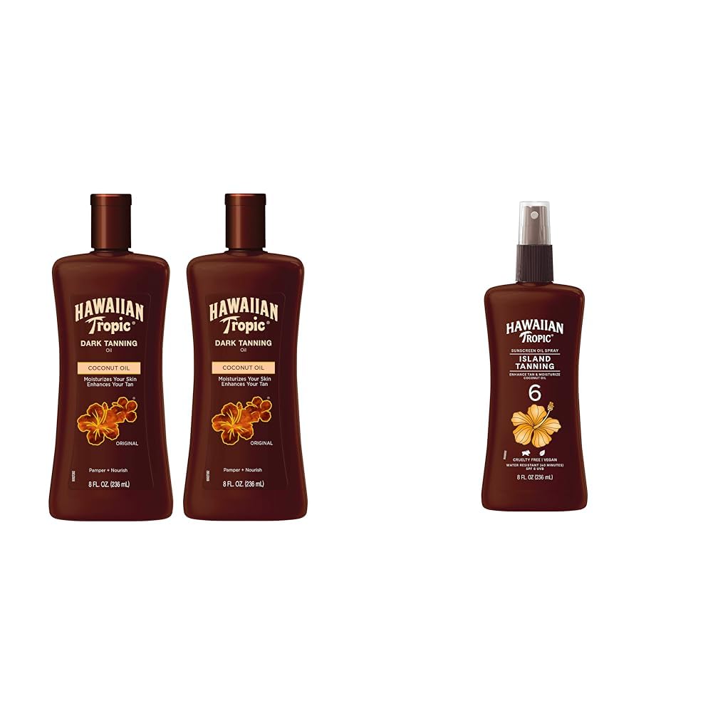 This twin pack of Hawaiian Tropic tanning oils includes one 8oz bottle of Dark Tanning Oil and one 8oz can of Island Tanning Oil Spray with SPF 6 sunscreen. Both oils feature coconut oil and cocoa butter to deeply moisturize skin while enhancing your tan. The Dark Tanning Oil's rich, luxurious formula nourishes skin with island-inspired botanicals like papaya and passion fruit. It has Hawaiian Tropic's iconic tropical scent and is cruelty-free and oxybenzone-free. Use it with an after sun lotion for soft, luminous skin. The lightweight Island Tanning Oil Spray provides sheer SPF 6 sun protection. Its oil-gel consistency offers complete coverage to moisturize and maintain soft skin while tanning. This spray also contains lush, tropical botanicals and Hawaiian Tropic's signature scent. It's water resistant for 80 minutes and thoughtfully formulated without oxybenzone or octinoxate while still being cruelty-free. Pair with an after sun lotion for lasting hydration. With one rich oil to enhance your tan paired with a lighter sunscreen spray, this bundle offers complementary tanning and skincare products to help you achieve beautiful, sun-kissed skin all summer long.