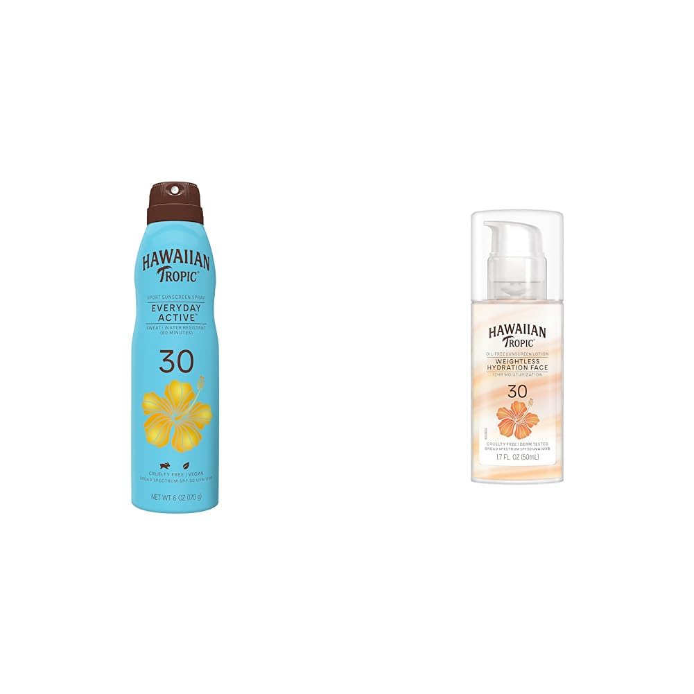 The Hawaiian Tropic Sunscreen Bundle includes a 6oz spray and 1.7oz lotion sunscreen. The Everyday Active Continuous Clear Spray SPF 30 provides invisible, breathable sun protection in an ultra-light formula that goes on clear for all skin tones. It is water and sweat resistant for up to 80 minutes with a twist-lock spray nozzle for easy, mess-free application. The Weightless Hydration Face Sunscreen Lotion SPF 30 is a lightweight, daily use formula that feels barely there and provides 12 hours of hydration with a matte, pore-friendly finish. Both dermatologist-tested sunscreens offer broad spectrum SPF 30 protection, are hypoallergenic and oil-free, and contain Hawaiian Tropic's signature island-inspired botanicals like papaya and aloe. They are cruelty-free with reef-safe formulas free of oxybenzone and octinoxate. With the convenience of a continuous spray and portable lotion, this bundle is ideal for active lifestyles and those looking for facial and body sun protection options that feel comfortable on skin while providing essential UVA UVB defense.
