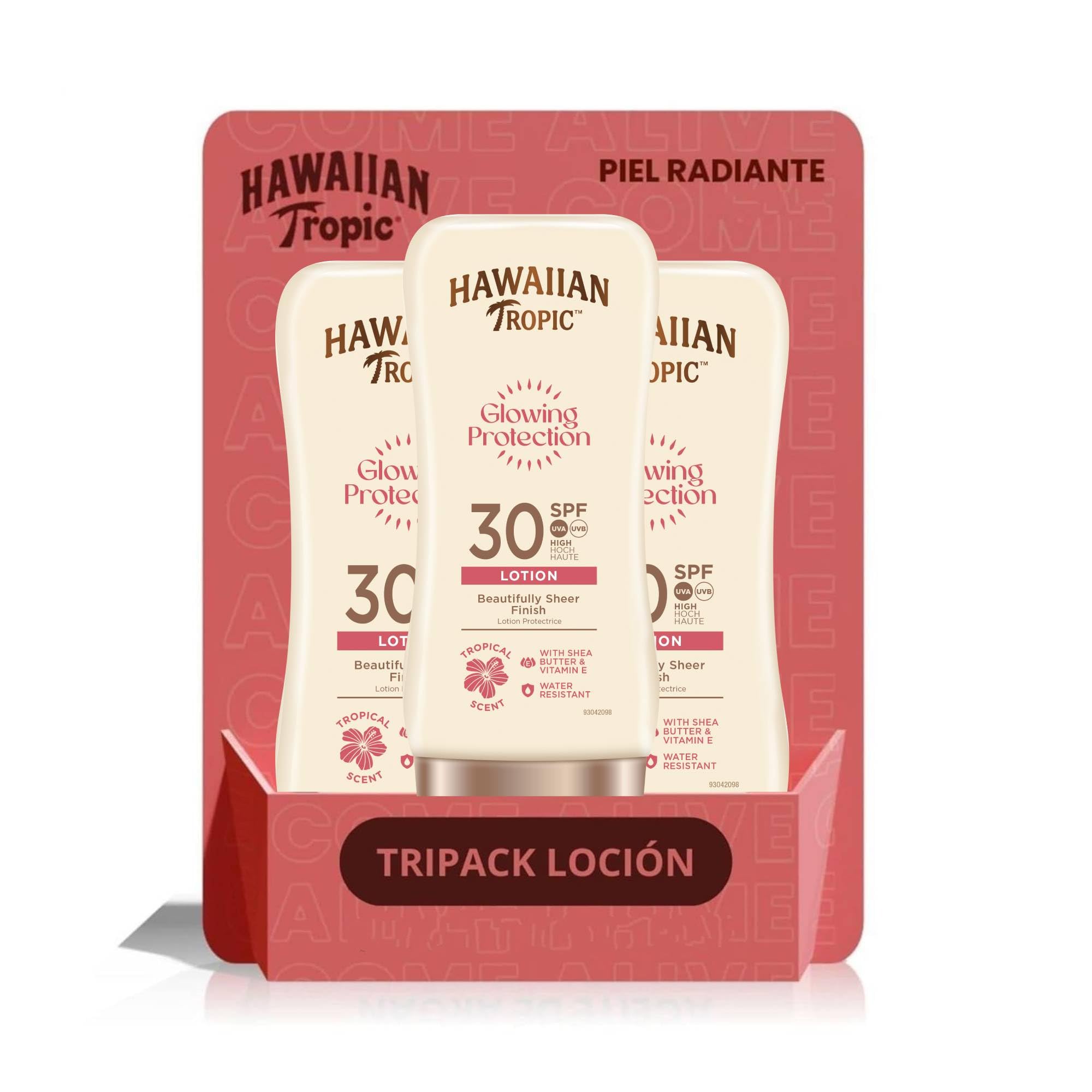 This "Ultra Radiance" formula sunscreen pack provides triple nourishment for the skin: it protects, softens, and leaves skin radiant. An irresistible blend of tropical fruits and vitamins C and E. Very high sun protection: SPF 30 , water-resistant. Lotion size: 180 ml. Recommended by the Skin Cancer Association. With the Hawaiian Tropic quality guarantee. Sunscreen for oily, combination, normal, or sensitive skin. INSTRUCTIONS 1. Apply sunscreen before sun exposure. 2. Reapply after swimming or sweating. 3. Follow the specific recommendations on the packaging. SAFETY WARNING Do not apply to the eyes. Keep out of reach of children. See more