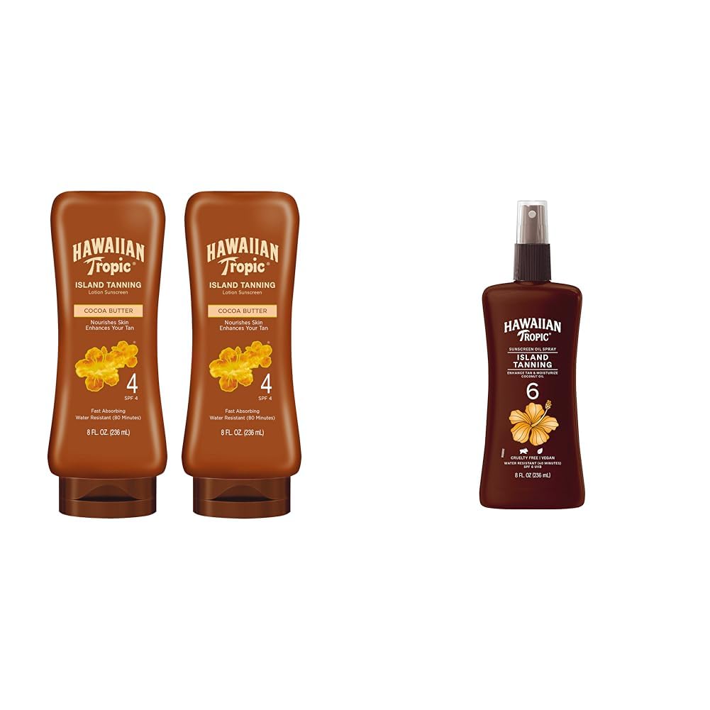 Use with Lime Coolada or Weightless Hydration after sun lotion for a long-lasting tan. Formulated without oxybenzone or octinoxate and PETA-certified cruelty-free. Water resistant for 80 minutes and enhanced with island botanicals like aloe, papaya and passion fruit. Tropical scented tanning lotion and oil spray contain shea butter, cocoa butter, and coconut oil to nourish skin. Hawaiian Tropic's fast-absorbing SPF 4 tanning lotion and SPF 6 tanning oil spray bundle keeps skin hydrated and luminous in the sun.