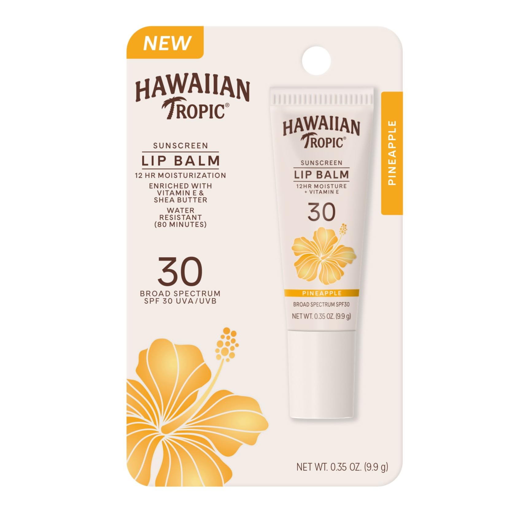 Hawaiian Tropic Lip Balm SPF 30 Pineapple is your beach essential for hydrated and protected lips. This SPF lip balm is infused with the tropical essence of pineapple. As a part of your sun care ritual, this sunscreen lip balm offers both water-resistance and broad-spectrum SPF protection, shielding your lips from harmful UVA and UVB rays. This 12 hour hydrating lip sunscreen melts into your lips, enriched with vitamin e and shea butter that nourishes and softens. Perfect for on-the-go travel, its compact size fits effortlessly into any beach tote or purse making it an easy travel sunscreen for lips.