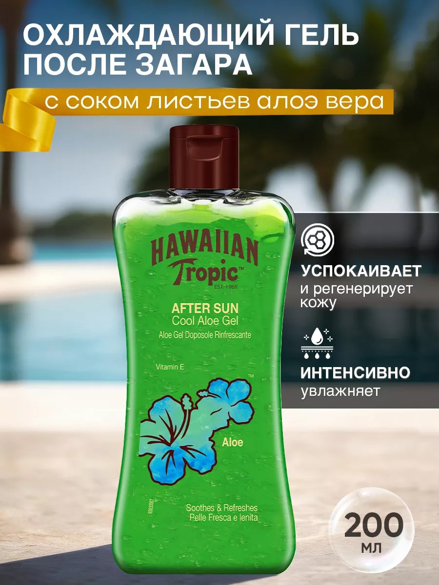 Охлаждающий гель после загара с алоэ вера After Sun Cooling Aloe Gel от американского бренда Hawaiian Tropic успокаивает кожу после солнечных ванн и дарит ей приятную свежесть. Содержит растительные ингредиенты с экзотических островов, питательные масла жожоба, кукуи и успокаивающий экстракт алоэ вера. Предотвращает потерю пигмента, продлевая жизнь вашему загару. Гель быстро впитывается в кожу, не оставляя липкой плёнки. Подходит для ежедневного использования. Гипоаллергенно. Протестировано дерматологами. Рекомендуется использовать после загара на солнце или в солярии. Равномерно нанесите средство на чистую кожу. Аромат: Тропический.Меры предосторожности:Регулярно используйте солнцезащитный крем широкого спектра защиты с SPF 15 или выше и другие меры защиты от солнца, в том числе указанные далее. Ограничивайте время, проводимое на солнце, особенно в период с 10 до 14 часов. Надевайте футболки с длинными рукавами, брюки, головные уборы и солнцезащитные очки.