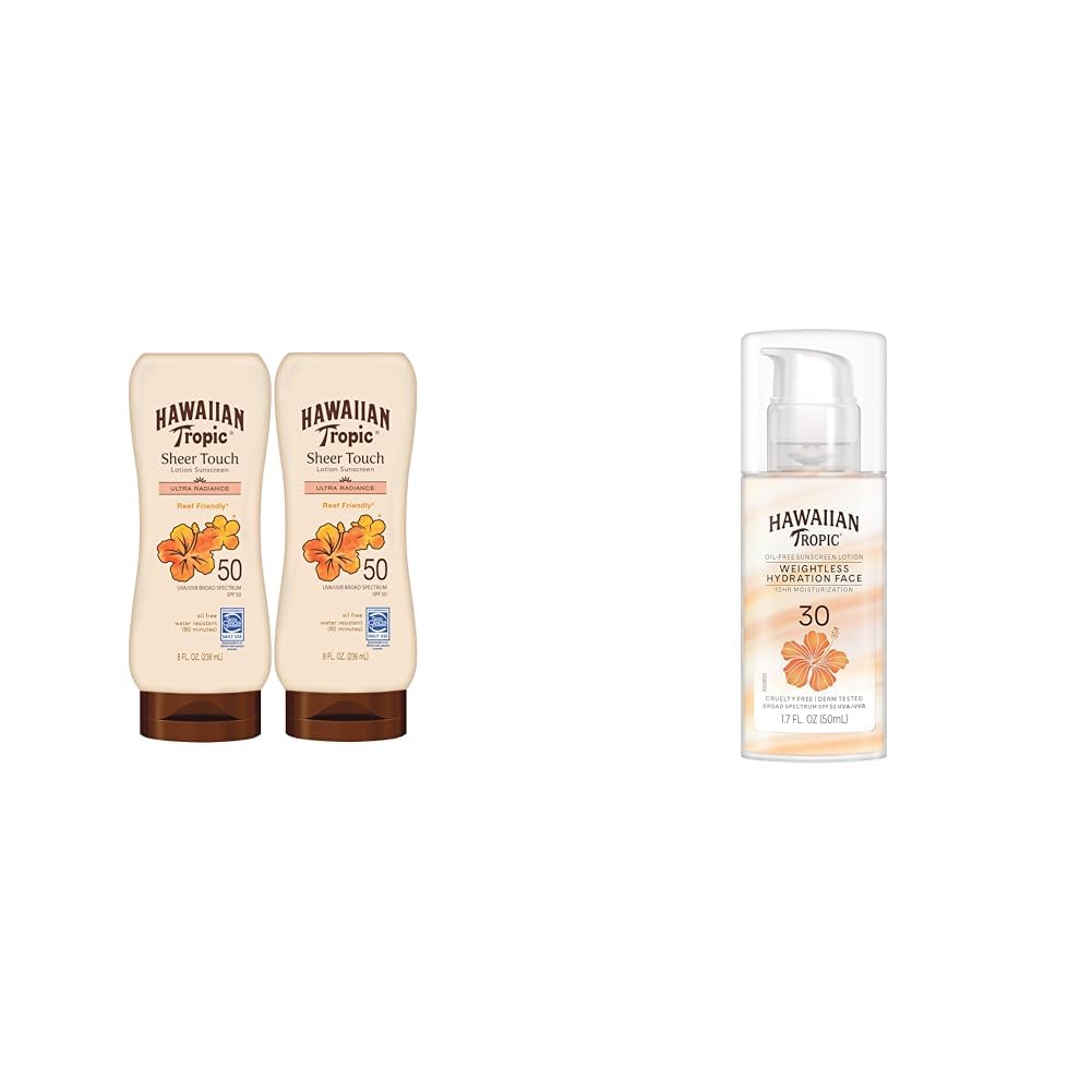 Hawaiian Tropic Sheer Touch Lotion Sunscreen SPF 50, 8oz Hawaiian Tropic Sunscreen SPF 50, Sunblock, Oxybenzone Free Sunscreen, Body Sunscreen Pack SPF 50, 8oz each Twin Pack Hawaiian Tropic Sheer Touch Ultra Radiance SPF 30 travel size sunscreen lotion offers triple enhancement for radiant skin it protects, softens, and leaves skin glowing. This luxurious formula has a hint of sheen and leaves your skin soft and luminous. Hawaiian Tropic Sheer Touch sunscreen lotion offers broad spectrum UVA and UVB protection in an oil-free and non-greasy formula. This ultra-conditioning formula contains Vitamins C E, with mango fruit extract and a shea butter complex for skin-loving suncare you can trust. We care for your skin with broad spectrum UVA and UVB protection, and we also do our part to help care for the planet by creating Cruelty-Free sunscreen that's free from oxybenzone and octinoxate. Hawaiian Tropic Weightless Hydration Lotion Sunscreen for Face SPF 30, 1.7oz Travel Size Sunscreen, Oil Free, Sunblock Face, Mini Formulated for your face, Hawaiian Tropic Weightless Hydration Face Sunscreen Lotion SPF 30 is perfect for your everyday beauty routine. This lightweight, breathable lotion feels as if it's barely on, with an ultra-light texture that feels light and smooth on skin, and a weightless matte finish so your skin can breathe. Our travel size sunscreen has a unique dual-ribbon hydrating formula that offers 12 hours of moisturization. This travel size face sunscreen is hypoallergenic, oil free, and won't clog pores. The compact, portable bottle comes with an easy-to-use airless pump for convenient reapplication throughout your day. Hawaiian Tropic Silk Hydration Weightless sunscreen is dermatologist tested and made with island-inspired botanicals and ingredients like papaya, mango, passion fruit, plumeria, guava, and aloe, for skin-loving suncare you can trust. We care for your skin with broad spectrum UVA and UVB protection, and we also do our part to help care for the planet by creating Cruelty-Free sunscreen that's free from oxybenzone and octinoxate.Product 2: SPF 30 FACE SUNSCREEN gives you 12-hour moisturization. Product 2: WEIGHTLESS FACE SUNSCREEN FORMULA feels as if it's barely on. Product 1: TRUSTED PROTECTION — Broad spectrum UVA and UVB coverage that's water resistant for up to 80 minutes. Product 1: ICONIC HAWAIIAN TROPIC SCENT — this tropical scented sunscreen lotion celebrates the island botanicals of Hawaii. Product 1: OIL-FREE SUNSCREEN LOTION WITH A NON-GREASY LOOK AND FEEL — contains vitamins C E to condition skin. Product 1: HAWAIIAN TROPIC SUNSCREEN LOTION SPF 50 with an Ultra Radiance formula that leaves skin luminous.