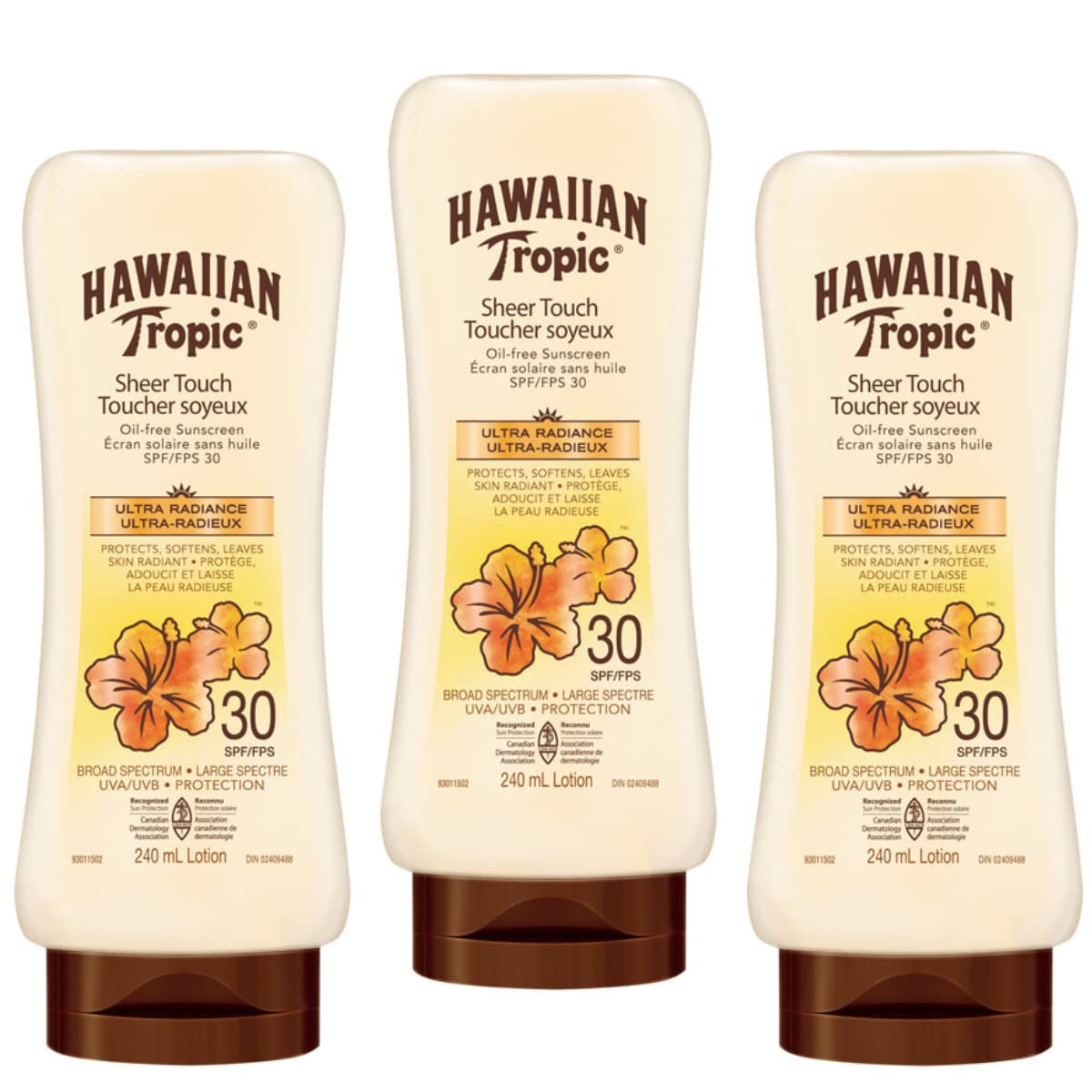 Hawaiian Tropic Sheer Touch Ultra Radiance Sunscreen Lotion offers a triple enhancement for radiant skin: protects, softens and leaves skin glowing. Its ultra-radiant formula, with a touch of glow, leaves your skin soft and luminous.Contains vitamins C and E and contains mango extract and a shea butter complex. Parfum tropical signature. Sun protection recognized by the Canadian Dermatology Association. Broad spectrum UVA and UVB sun protection. Oil-free, non-greasy formula with a rich, luxurious feel that leaves skin visibly soft and radiant.