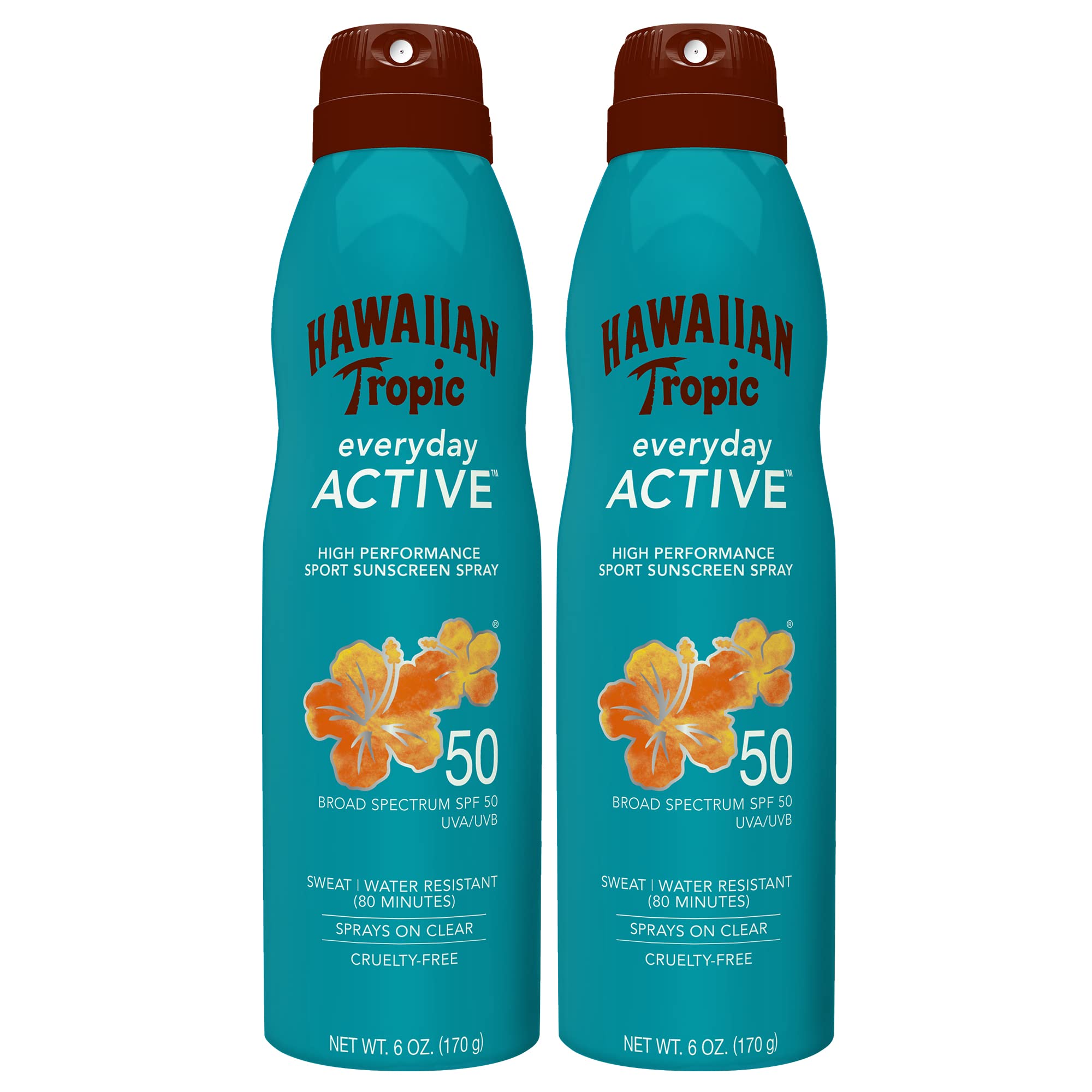Hawaiian Tropic Sheer Touch Ultra Radiance Lotion Sunscreen SPF 50, 8oz Twin Pack Hawaiian Tropic Sunscreen SPF 50, Sunblock, Oxybenzone Free Sunscreen, Body Sunscreen Pack, 8oz each Hawaiian Tropic Sheer Touch Ultra Radiance SPF 30 travel size sunscreen lotion offers triple enhancement for radiant skin it protects, softens, and leaves skin glowing. This luxurious formula has a hint of sheen and leaves your skin soft and luminous. Hawaiian Tropic Sheer Touch sunscreen lotion offers broad spectrum UVA and UVB protection in an oil-free and non-greasy formula. This ultra-conditioning formula contains Vitamins C E, with mango fruit extract and a shea butter complex for skin-loving suncare you can trust. We care for your skin with broad spectrum UVA and UVB protection, and we also do our part to help care for the planet by creating Cruelty-Free sunscreen that's free from oxybenzone and octinoxate. Hawaiian Tropic Everyday Active Spray Sunscreen SPF 50, 6oz Hawaiian Tropic Sunscreen SPF 50, Sunblock, Oxybenzone No Sunscreen, Spray On Sunscreen, Body Sunscreen Spray SPF 50, 6oz each Twin Pack Hawaiian Tropic Everyday Active Continuous Sunscreen Spray SPF 50 is an ultra-light, high-performance sunscreen that keeps up with your everyday active lifestyle with your beauty in mind, whether you're taking your favorite outdoor workout class, hiking with your dog, or catching a few waves. This breathable formula is non-greasy and sprays on clear so it's great for all skin tones. This sunscreen is water and sweat resistant, and it won't sting your eyes. The continuous spray nozzle helps with fast and easy application and has a twist lock top so there's no need for an extra cap! Hawaiian Tropic Sport sunscreen is dermatologist tested and made with island-inspired botanicals and ingredients like papaya, mango, passion fruit, plumeria, guava, and aloe for skin-loving suncare you can trust. We care for your skin with broad spectrum UVA and UVB protection, and we also do our part to help care for the planet by creating Cruelty-Free sunscreen that's free from oxybenzone and octinoxate.Product 2: GOES ON CLEAR — Hawaiian Tropic sunscreen SPF 50 for invisible sun protection. Product 2: BREATHABLE, ULTRALIGHT, HIGH-PERFORMANCE SPF 50 sunscreen spray formula. Product 1: TRUSTED PROTECTION — Broad spectrum UVA and UVB coverage that's water resistant for up to 80 minutes. Product 1: ICONIC HAWAIIAN TROPIC SCENT — this tropical scented sunscreen lotion celebrates the island botanicals of Hawaii. Product 1: OIL-FREE SUNSCREEN LOTION WITH A NON-GREASY LOOK AND FEEL — contains vitamins C E to condition skin. Product 1: HAWAIIAN TROPIC SUNSCREEN LOTION SPF 50 with an Ultra Radiance formula that leaves skin luminous.