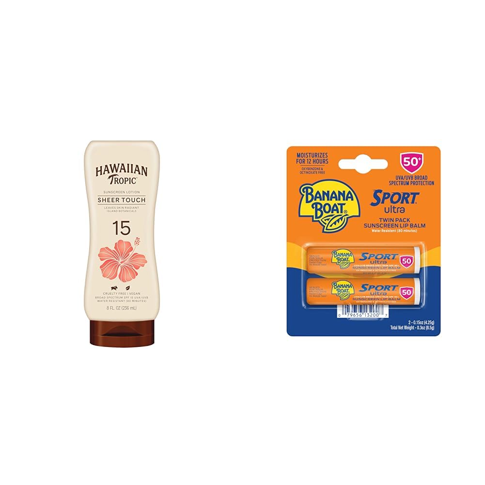 Hawaiian Tropic Sheer Touch Ultra Radiance SPF 15 Sunscreen Lotion and Banana Boat Sport Ultra SPF 50 Lip Balm Twin Pack
