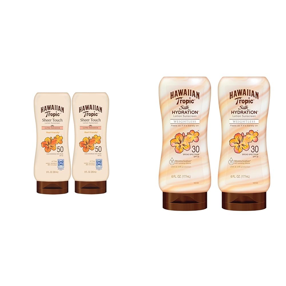 The Hawaiian Tropic sunscreen bundle includes two complementary sun protection products to help keep your skin safe and nourished in the sun. The first product is an 8oz twin pack of Hawaiian Tropic Sheer Touch Ultra Radiance lotion with SPF 50. This oil-free, non-greasy formula contains vitamins C and E as well as botanical ingredients like mango and shea butter to condition skin while providing broad spectrum UVA UVB protection. Its hint of sheen leaves skin looking luminous. The second product is a 6oz twin pack of Hawaiian Tropic's lightweight, hydrating lotion with SPF 30. This dual-ribbon formula moisturizes skin for 12 hours while feeling barely-there. It is made with tropical, island-inspired ingredients like papaya, passion fruit, and aloe to nurture skin. Like all Hawaiian Tropic sunscreens, both products feature a signature tropical scent and are cruelty-free as well as oxybenzone and octinoxate free. With different SPF levels and skin care focuses, these Hawaiian Tropic sunscreens perfectly complement each other. The SPF 50 provides powerful sun protection while the SPF 30 hydrates skin over time, together helping you achieve safe, nourished, radiant skin in the sun.