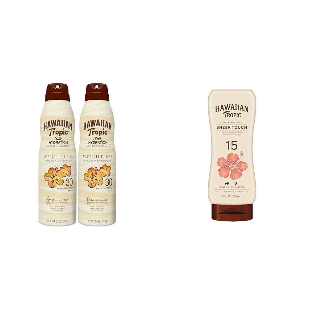 Product 2: OIL-FREE SUNSCREEN LOTION WITH A NON-GREASY LOOK AND FEEL — contains vitamins C E to condition skin. Product 2: HAWAIIAN TROPIC SUNSCREEN LOTION SPF 15 with an Ultra Radiance formula that leaves skin luminous. Product 1: LIGHTWEIGHT AND NON-GREASY — Hawaiian Tropic Weightless Hydration won't weigh you down. Product 1: SPF 30 CLEAR SUNSCREEN with 12-hour moisturization. Product 1: CONTINUOUS SPRAY SUNSCREEN with a twist-lock top for fast, mess-free application. Product 1: WEIGHTLESS CLEAR SUNSCREEN SPRAY FORMULA looks and feels as if it's barely on.