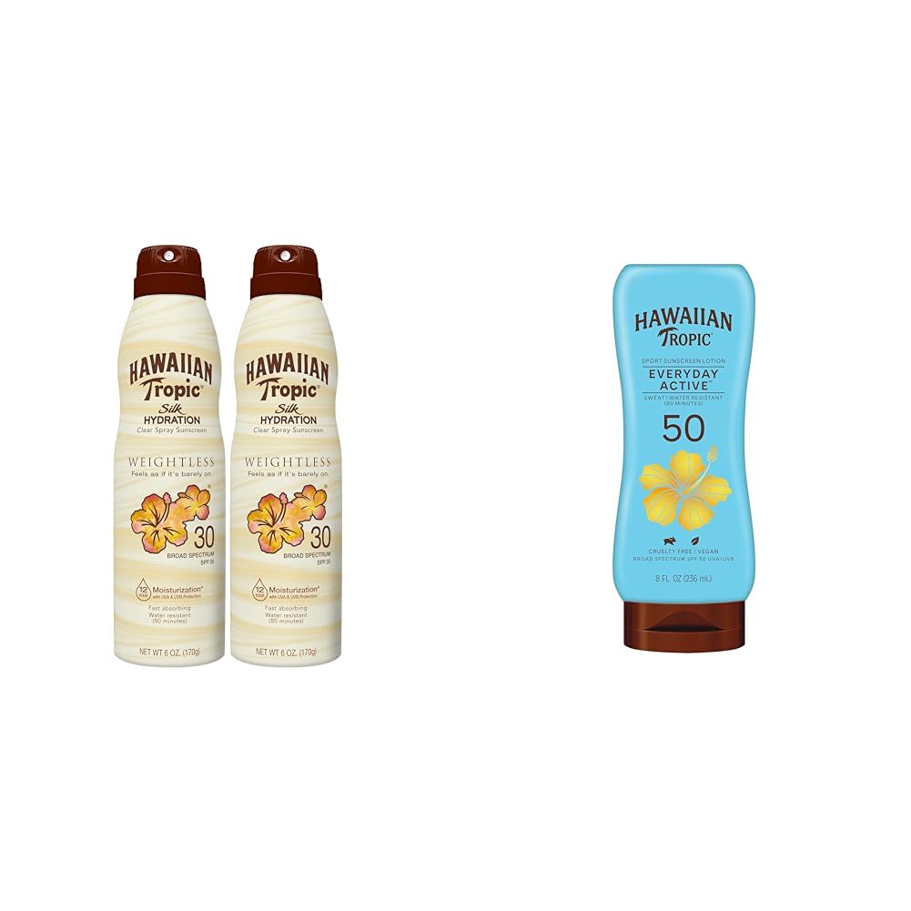 Hawaiian Tropic Weightless Hydration Clear Spray Sunscreen SPF 30 Twin Pack 6oz each & Everyday Active Lotion Sunscreen SPF 50 8oz