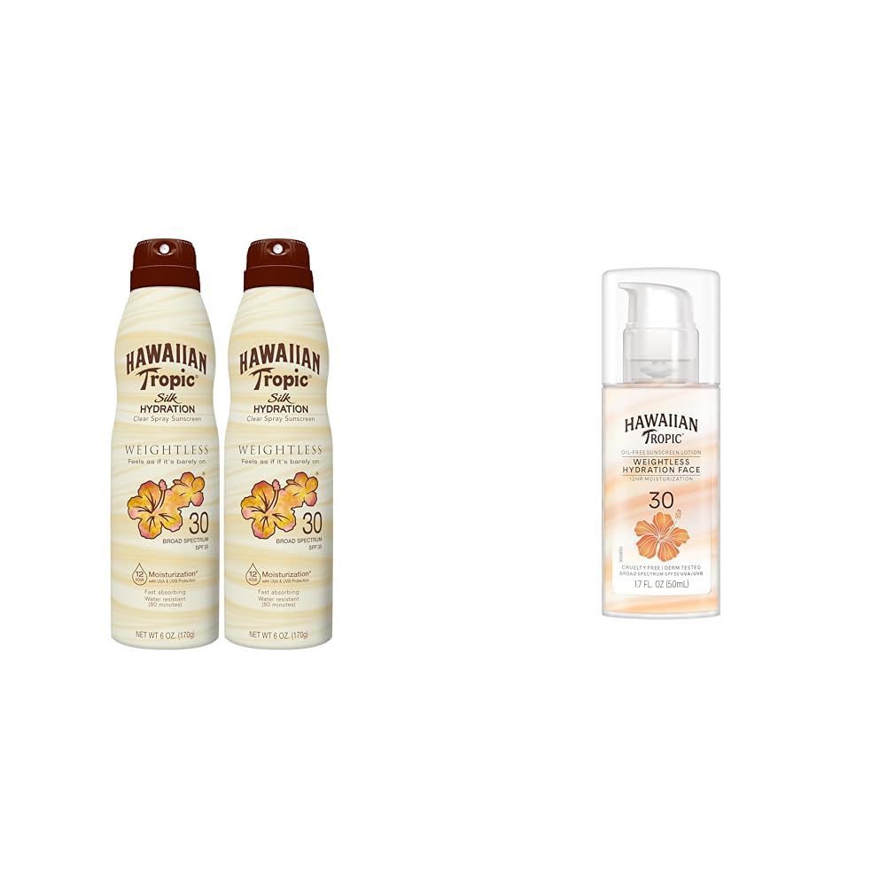 Hawaiian Tropic Weightless Hydration Clear Spray Sunscreen SPF 30, 6oz Twin Pack Hawaiian Tropic Sunscreen SPF 30, Sunblock, Oxybenzone Free Sunscreen, Spray On Sunscreen Pack, 6oz each Hawaiian Tropic Weightless Hydration Continuous Sunscreen Spray SPF 30 Twin Pack is a lightweight clear formula that looks and feels as if it's barely on! This hydrating formula offers 12 hours of moisturization and leaves skin feeling silky soft. The continuous spray nozzle helps with fast and easy application and has a twist lock top so there's no need for an extra cap! Hawaiian Tropic Silk Hydration Weightless clear sunscreen is dermatologist tested and made with island-inspired botanicals and ingredients like papaya, mango, passion fruit, plumeria, guava, and aloe, for skin-loving suncare you can trust. Our sunscreen pack cares for your skin with broad spectrum UVA and UVB protection, and we also do our part to help care for the planet by creating Cruelty-Free sunscreen that's free from oxybenzone and octinoxate. Hawaiian Tropic Weightless Hydration Lotion Sunscreen for Face SPF 30, 1.7oz Travel Size Sunscreen, Oil Free Face Sunscreen, Hawaiian Tropic Sunscreen SPF 30, Sunblock Face, Mini Sunscreen, 1.7oz Formulated for your face, Hawaiian Tropic Weightless Hydration Face Sunscreen Lotion SPF 30 is perfect for your everyday beauty routine. This lightweight, breathable lotion feels as if it's barely on, with an ultra-light texture that feels light and smooth on skin, and a weightless matte finish so your skin can breathe. Our travel size sunscreen has a unique dual-ribbon hydrating formula that offers 12 hours of moisturization. This travel size face sunscreen is hypoallergenic, oil free, and won't clog pores. The compact, portable bottle comes with an easy-to-use airless pump for convenient reapplication throughout your day. Hawaiian Tropic Silk Hydration Weightless sunscreen is dermatologist tested and made with island-inspired botanicals and ingredients like papaya, mango, passion fruit, plumeria, guava, and aloe, for skin-loving suncare you can trust. We care for your skin with broad spectrum UVA and UVB protection, and we also do our part to help care for the planet by creating Cruelty-Free sunscreen that's free from oxybenzone and octinoxate.Product 2: SPF 30 FACE SUNSCREEN gives you 12-hour moisturization. Product 2: WEIGHTLESS FACE SUNSCREEN FORMULA feels as if it's barely on. Product 1: LIGHTWEIGHT AND NON-GREASY — Hawaiian Tropic Weightless Hydration won't weigh you down. Product 1: SPF 30 CLEAR SUNSCREEN with 12-hour moisturization. Product 1: CONTINUOUS SPRAY SUNSCREEN with a twist-lock top for fast, mess-free application. Product 1: WEIGHTLESS CLEAR SUNSCREEN SPRAY FORMULA looks and feels as if it's barely on.