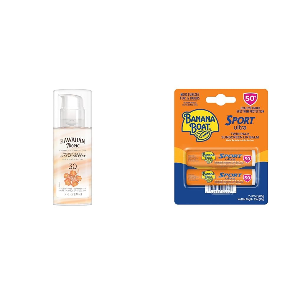 Hawaiian Tropic Weightless Hydration Lotion Sunscreen for Face SPF 30, 1.7oz Travel Size Sunscreen, Oil Free, Sunblock Face, Mini Formulated for your face, Hawaiian Tropic Weightless Hydration Face Sunscreen Lotion SPF 30 is perfect for your everyday beauty routine. This lightweight, breathable lotion feels as if it's barely on, with an ultra-light texture that feels light and smooth on skin, and a weightless matte finish so your skin can breathe. Our travel size sunscreen has a unique dual-ribbon hydrating formula that offers 12 hours of moisturization. This travel size face sunscreen is hypoallergenic, oil free, and won't clog pores. The compact, portable bottle comes with an easy-to-use airless pump for convenient reapplication throughout your day. Hawaiian Tropic Silk Hydration Weightless sunscreen is dermatologist tested and made with island-inspired botanicals and ingredients like papaya, mango, passion fruit, plumeria, guava, and aloe, for skin-loving suncare you can trust. We care for your skin with broad spectrum UVA and UVB protection, and we also do our part to help care for the planet by creating Cruelty-Free sunscreen that's free from oxybenzone and octinoxate. Banana Boat Sport Ultra SPF 50 Lip Sunscreen 2 Pack SPF Lip Balm Pack, SPF 50, Oxybenzone Free Sunscreen, Lip Sunblock, Travel Size Sunscreen for Lips SPF 50, Twin Pack Great for your active lifestyle! Banana Boat Sport Ultra Sunscreen Lip Balm provides strong protection that absorbs quickly, and is non-greasy. This lightweight SPF lip balm is designed especially for sport enthusiasts and other active individuals who need sport-strength sun protection that doesn't play around! Banana Boat Sport Ultra Sunscreen Lip Balm moisturizes and protects dry lips. It will last as long as the fun does ! Reapply this safe and effective broad spectrum UVA and UVB protection as directed on the product label. Protect the fun on earth with Banana Boat!Product 2: CLINICALLY PROVEN UVA UVB PROTECTION — This SPF 50 broad spectrum lip sunscreen protects your lips from the sun's harmful UV rays. Product 2: SUPERIOR ENDURANCE VS. SWEAT WATER — From family fun to hardcore competition, Banana Boat Sport Sunscreen provides strong sun protection that stays on so you can play on. Product 1: DERMATOLOGIST TESTED sunscreen SPF 30. Product 1: WON'T CLOG PORES — Hawaiian Tropic face sunscreen is hypoallergenic and oil free. Product 1: SPF 30 FACE SUNSCREEN gives you 12-hour moisturization. Product 1: WEIGHTLESS FACE SUNSCREEN FORMULA feels as if it's barely on.