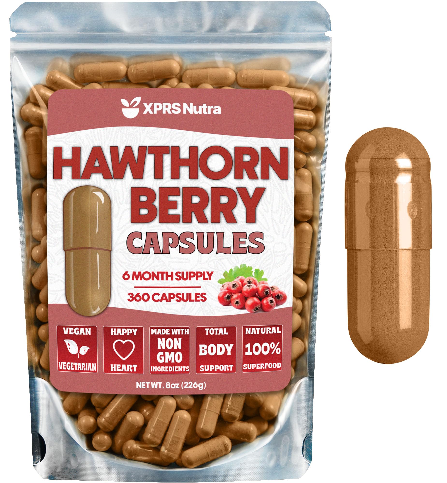 Love Your Supplements: You'll love the superior quality of our organic hawthorn berry capsules. Here at XPRS Nutra, our first priority is ensuring that we are providing our customers with premium hawthorn extract supplement in an ethical manner and at an affordable price. Thank you for your purchase of fresh hawthorn berry - you're helping to support a local business that employs locally. Multiple Health Benefits: Hawthorne berries are a popular choice for concentration, endurance, energy and digestion. In fact, the benefits of hawthorn berry tablets are too numerous to list! Research hawthorn berry tincture to learn of its many uses. Our hawthorn pills are vegan-friendly and gluten-free. We love our espino blanco hawthorn supplement and take it ourselves!. Mental Kickstart: Hawthorn berry herb contains high amounts of chlorogenic acid (CGA) that supercharges cognitive function. Want to have laser focus? Try our hawthorne powder today! Not only does hawthorn berry extract support optimum brain activity but hawthorn berry whole is a potent hair and skin nutrient. Try organic hawthorn berries whole for total body support and be amazed!. Immune System Boost: Hawthorne extract capsules are full of flavonoids that help immune cells fight free radicals. Just one serving every morning of hawthorn extract capsules that are packed with nutritious hawthorn berries will get your day off to a good start! Have confidence that our hawthorne berry supplements are fresh and lab tested for purity. Heart Hero: Our hawthorn berry capsules contain 100 pure hawthorne supplement with zero additives and preservatives. Try our potent hawthorn berry supplement in capsules to nourish your cardiovascular system every day. No need to worry about the taste, our hawthorne berry powder is conveniently packaged in vegan pills produced sustainably in USA.