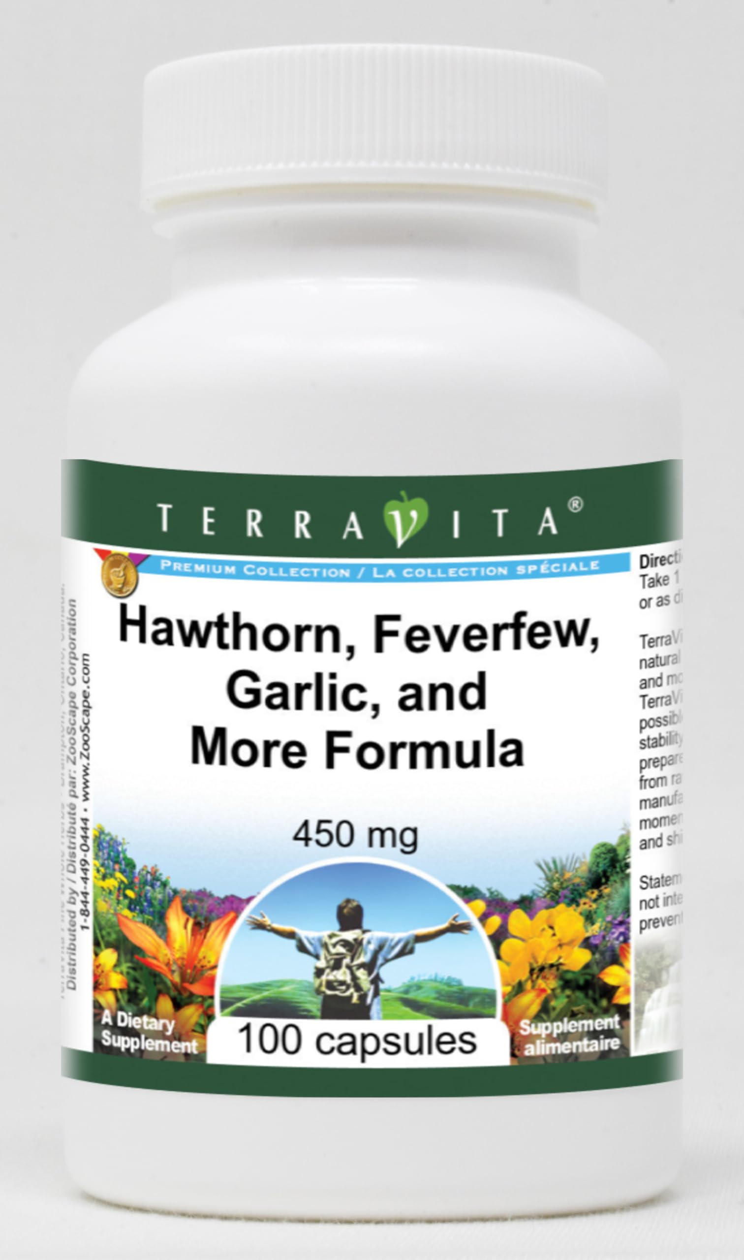 Hawthorn, Feverfew, Garlic, and More Formula - 450 mg (100 capsules, ZIN: 517114) Packaged in the United States in a GMP certified facility (Good Manufacturing Practice). No fillers. Manufacturer: TerraVita Size: 100 capsules Easy-to-swallow Capsules in a sealed bottle. Ingredients: Gelatin, Water, Echinacea Purpurea Root - 90, Feverfew Leaf - 90, Garlic - 90 mg, Goldenseal - 90 mg (Herb), Hawthorn - 90 mg (Flower and Leaf)