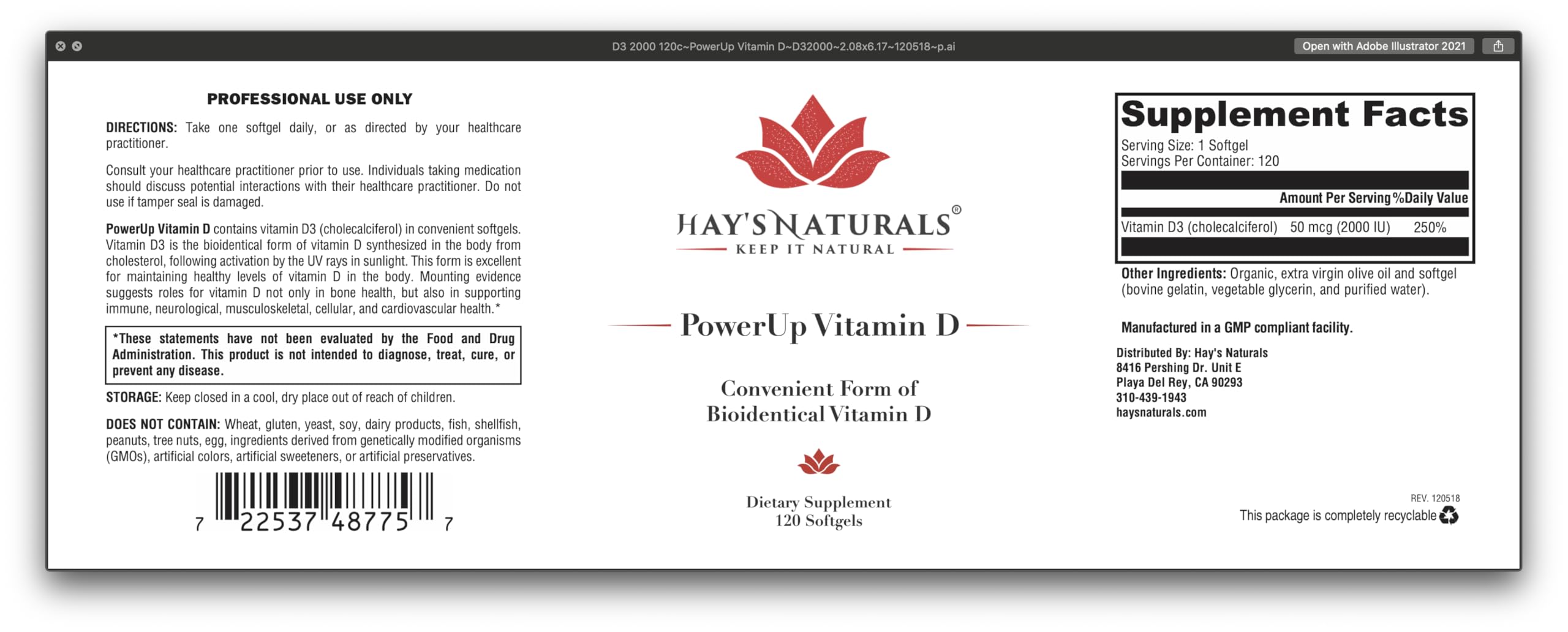 Hay's Naturals PowerUp Vitamin D3 2000 - Maintain Healthy Immune System and Vitality | High Potency, Non-GMO, Supplement - 120 Softgel Capsules - 4 Month Supply