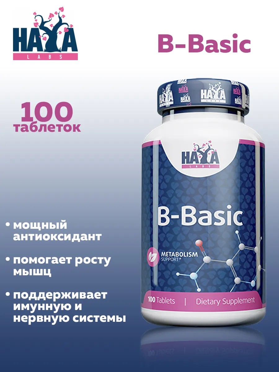 B-Basic from Haya Labs contains a full spectrum of B vitamins that improve overall health, stimulate metabolism, and have a beneficial effect on the nervous system. Thiamine promotes liver function and supports the digestive system. Riboflavin stimulates lean muscle mass, improves metabolism, and plays an important role in maintaining vision. The formula includes niacin, which lowers cholesterol and high blood pressure. Niacin is involved in the formation of glucose, reducing the risk of heart disease. Pyridoxine prevents leg muscle cramps, promotes protein absorption, and stimulates nucleic acid synthesis. Water-soluble vitamin B9 improves amino acid and protein synthesis. Vitamin B12 stimulates brain function and supports protein metabolism. Biotin maintains healthy nails, hair, and skin. Choline helps burn excess fat in the body. Vitamin B8 promotes cell division and supports the formation of cell membranes. One dose: 1 tablet. Recommended intake: Take 1 dose daily with food. Doses per package: 100.