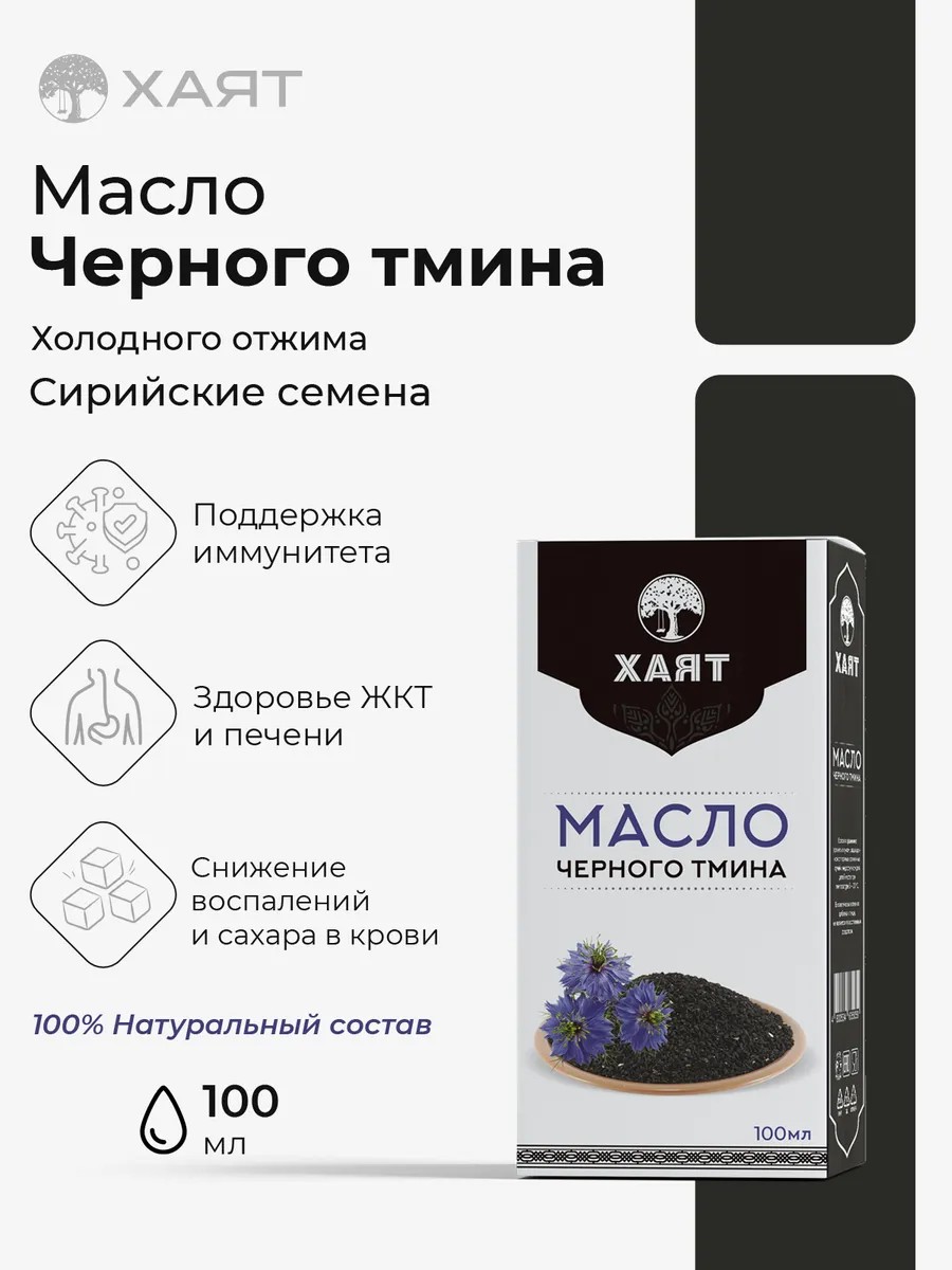 Масло черного тмина от Хаят — это высококачественный продукт холодного отжима, полученный из семян черного тмина, выращенных в экологически чистых регионах. Масло производится в стекле, что помогает сохранить все его ценные свойства. Это чистое масло чёрного тмина содержит мощные биологически активные вещества, включая тимохинон, известный своими оздоравливающими свойствами.