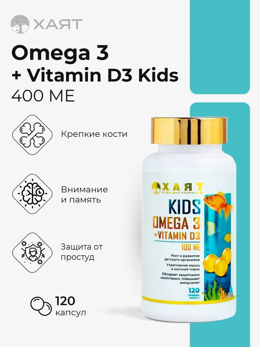 Капсулы Kids Omega 3 + Vitamin D3 400 me Хаят — это эффективное средство для детей, созданное для поддержания крепкого здоровья и гармоничного развития. В составе препарата сочетаются омега 3 и витамин д3, что обеспечивает комплексное действие на организм ребёнка. Эти капсулы являются одними из самых лучших витаминов для детей, которые способствуют укреплению иммунитета, нормальной работе сердца и сосудов, а также поддерживают здоровье мозга и улучшение кровоснабжения головного мозга.