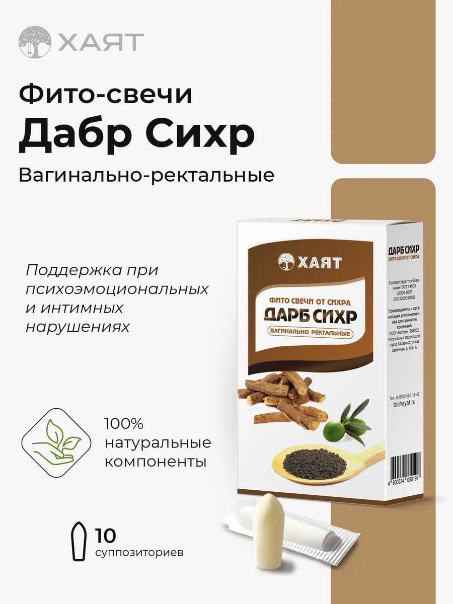 Фито свечи Дарб Сихр ХАЯТ — это универсальные вагинальные и ректальные фитосвечи с натуральным составом, разработанные для комплексного подхода к женскому и мужскому здоровью. Это средство сочетает в себе традиции фитотерапии и современные разработки, направленные на лечение и профилактику широкого спектра интимных и психосоматических проблем. Дарб Сихр — это больше, чем просто гинекологические или ректальные препараты. Это недорогое и эффективное решение, созданное для восстановления физического и энергетического баланса организма.