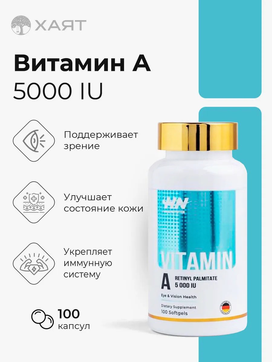 Витамин А от фирмы Хаят– жизненно необходим для нашего организма. Он отвечает за здоровье глаз, иммунную систему и влияет на синтез белков. Особенно он полезен для беременных женщин, поскольку играет значительную роль в росте и развитии плода. Необходимость витамина А доказали многочисленные исследования.Витамин А участвует в синтезе родопсина, или зрительного пурпура, — глазного пигмента, который отвечает за адаптацию зрения к темноте и различение цветов.Также доказано, что прием витамина А в достаточном количестве снижает риск дегенерации желтого пятна глаза и возрастной потери зрения. Витамин А:-стимулирует выработку коллагена — белка, который отвечает за эластичность кожи, тем самым защищая ее от дряблости и преждевременных морщин;-участвует в производстве и обновлении клеток эпидермиса;-увлажняет кожу и нормализует выработку кожного сала;-эффективен для лечения воспалений, ранок и акне. Американская академия дерматологии рекомендует использовать средства с витамином А для лечения угревой сыпиВитамин А важен для иммунной системы, поскольку он: -участвует в синтезе лейкоцитов — белых кровяных телец, которые отвечают за борьбу с болезнями (достаточное количество витамина А в рационе делает лейкоциты более живучими и эффективными в уничтожении паразитов и опухолей);-участвует в выработке антител — белков плазмы крови, которые также борются с инфекциями;-защищает организм от болезней, стимулируя производство новых клеток эпителиальных и слизистых тканей, а именно они служат естественным щитом тела от болезней из внешней среды.