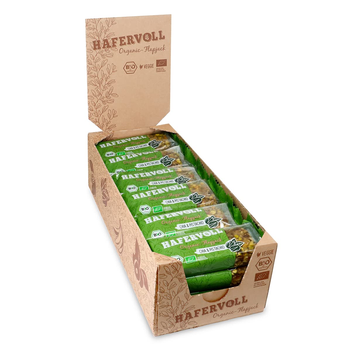 Oat organic flapjack chia & pistachio In the world of 1001 nights, what would be the right organic snack?Maybe a delicious bar made of roasted pistachie, sweet and sticky date and healthy chia seeds?Well then we have the right thing here.Inspired by the biscuit baklava, this flapjack manages to be much more than just a flapjack. Organic flapjack - what does that mean? The organic flapjacks from oats all consist of only oatmeal as the basis, honey for the sweet and dried fruits or nuts or seeds.All ingredients are from organic cultivation and therefore without chemical pesticides.What our flapjacks don't have: crystal sugar, sweeteners, artificial flavors and palm fat.It is only what really has to be in it. Quick in your pocket, quickly in your mouth: whether on the next hike, on a long drive, in the office, at school or in kindergarten you are the perfect snack in between. Ingredients / ingredients Ingredients: oatmeal* (41%), honey*, sunflower oil*, pistachios roasted* (12%), dried date pieces* (8%), chia seeds* (Salvia Hispanica) (3.5%), rice flour*.*from controlled organic cultivation.Can contain traces of milk, soy and other nuts. Instructions Ready for consumption.Unsurable.Recommended daily consumption quantity: 1 serving.Please do not eat the foil outside, then add to recycling. Warnings Allergen identification: contains gluten and nuts.Can contain traces of milk, soy, egg, sesame, peanuts and other shell fruits.Can contain pieces of shells. Address manufacturer/importer Senefelderstraße 44, 51469 Bergisch Gladbach More ?? Scope of delivery: 18 bars (1 bar = 60 g) oats Organic flapjack chia & pistachio without artificial additives, artificial flavors & palm oil.?? Perfect for on the go: Whether on the bike, hiking, in the office, in kindergarten or wherever it fits.It is quickly packed and can be taken anywhere.?? Bio certified: The flapjack only consists of bio-certified ingredients from front to back.Here you don't just do something good for yourself.?? Natural sweetie: The flapjacks from oats all can do without the addition of sugar.Their sweetness comes from honey and the natural ingredients.?? full of oats: This is more than just a bar.The roasted pistachios, the chia seeds, the sweet-sticky dates in combination with organic harrow flakes, also make every dessert heart beat faster.?? From Classic to Organic: Because our future and resources are very important to us, it is now 100% organic.Thus, Classic Flapjack Chia Pistachie ? Organic Flapjack Chia & Pistachio: The Classic bars are only available as long as the stock is enough!. HAFERVOLL ORGANIC FLAPJACK CHIA & PISTACHIO In der Welt von 1001 Nacht, was wäre da wohl der passende Bio-Snack? Vielleicht ein leckerer Riegel aus gerösteter Pistazie, süß-klebriger Dattel und gesunden Chia-Samen? Na dann haben wir hier genau das Richtige. Inspiriert von dem Gebäck Baklava, schafft es dieser Flapjack viel mehr zu sein als nur ein Flapjack. Organic Flapjack – was bedeutet das? Die Organic Flapjacks von HAFERVOLL bestehen alle nur aus Haferflocken als Basis, Honig für die Süße und getrockneten Früchten oder Nüssen oder Samen. Alle Zutaten sind aus biologischem Anbau und damit ohne chemische Pflanzenschutzmittel. Was unsere Flapjacks alle nicht haben: Kristallzucker, Süßstoffe, künstliche Aromen und Palmfett. Drin ist nur, was wirklich drin sein muss. Schnell in der Tasche, schnell im Mund: Ob auf der nächsten Wanderung, auf einer langen Autofahrt, im Büro, in der Schule oder im Kindergarten sind sie der perfekte Snack für zwischendurch. INHALTSSTOFFE / ZUTATEN Zutaten: HAFERFLOCKEN* (41%), Honig*, Sonnenblumenöl*, PISTAZIEN geröstet* (12%), getrocknete Dattelstücke* (8%), Chiasamen* (Salvia hispanica) (3,5%), Reismehl*. *aus kontrolliert biologischem Anbau. Kann Spuren von Milch, Soja und anderen Nüssen enthalten. GEBRAUCHSANWEISUNG Verzehrfertig. Ungekühlt haltbar. Empfohlene tägliche Verzehrmenge: 1 Portion. Bitte die Folie außenrum nicht mitessen, danach ins Recycling geben. WARNHINWEISE Allergenkennzeichnung: Enthält Gluten und Nüsse. Kann Spuren von Milch, Soja, Ei, Sesam, Erdnüssen und anderen Schalenfrüchten enthalten. Kann Stücke von Schalen enthalten. ANSCHRIFT HERSTELLER/IMPORTEUR Senefelderstraße 44, 51469 Bergisch Gladbach Mehr?? Lieferumfang: 18 Riegel (1 Riegel = 60 g) HAFERVOLL Organic Flapjack Chia & Pistachio ohne künstliche Zusatzstoffe, künstliche Aromen & Palmöl. ?? Perfekt für unterwegs: Ob auf dem Fahrrad, beim Wandern, im Büro, im Kindergarten oder wo auch immer es grade passt. HAFERVOLL ist schnell eingepackt und kann überall hin mitgenommen werden. ?? Bio zertifiziert: Der Flapjack besteht von vorne bis hinten nur aus bio-zertifizierten Zutaten. Hier tust du nicht nur dir selber etwas Gutes. ?? Natürliche Süße: Die Flapjacks von HAFERVOLL kommen alle ganz ohne den Zusatz von Zucker aus. Ihre Süße kommt allein von Honig und den natürlichen Zutaten. ?? Voller Hafer: Das hier ist mehr als nur ein Riegel. Die gerösteten Pistazien, die Chiasamen, die süß-klebrige Dattel in Kombination mit Bio-Haferflocken lassen auch jedes Dessert-Herz schneller schlagen. ?? Von Classic zu Organic: Weil uns unsere Zukunft und Ressourcen sehr wichtig sind, ist HAFERVOLL jetzt zu 100% Bio. Somit wird aus Classic Flapjack Chia Pistazie ? Organic Flapjack Chia & Pistachio: Die Classic Riegel gibt es nur noch so lange der Vorrat reicht!.HAFERVOLL Organic Flapjack Chia & Pistachio, 18 x 60 g Müsliriegel - Bio-zertifiziert, mit Honig ohne Zusatz von Zucker, Hafer, im Ofen gebacken Organic Chia & Pistachio