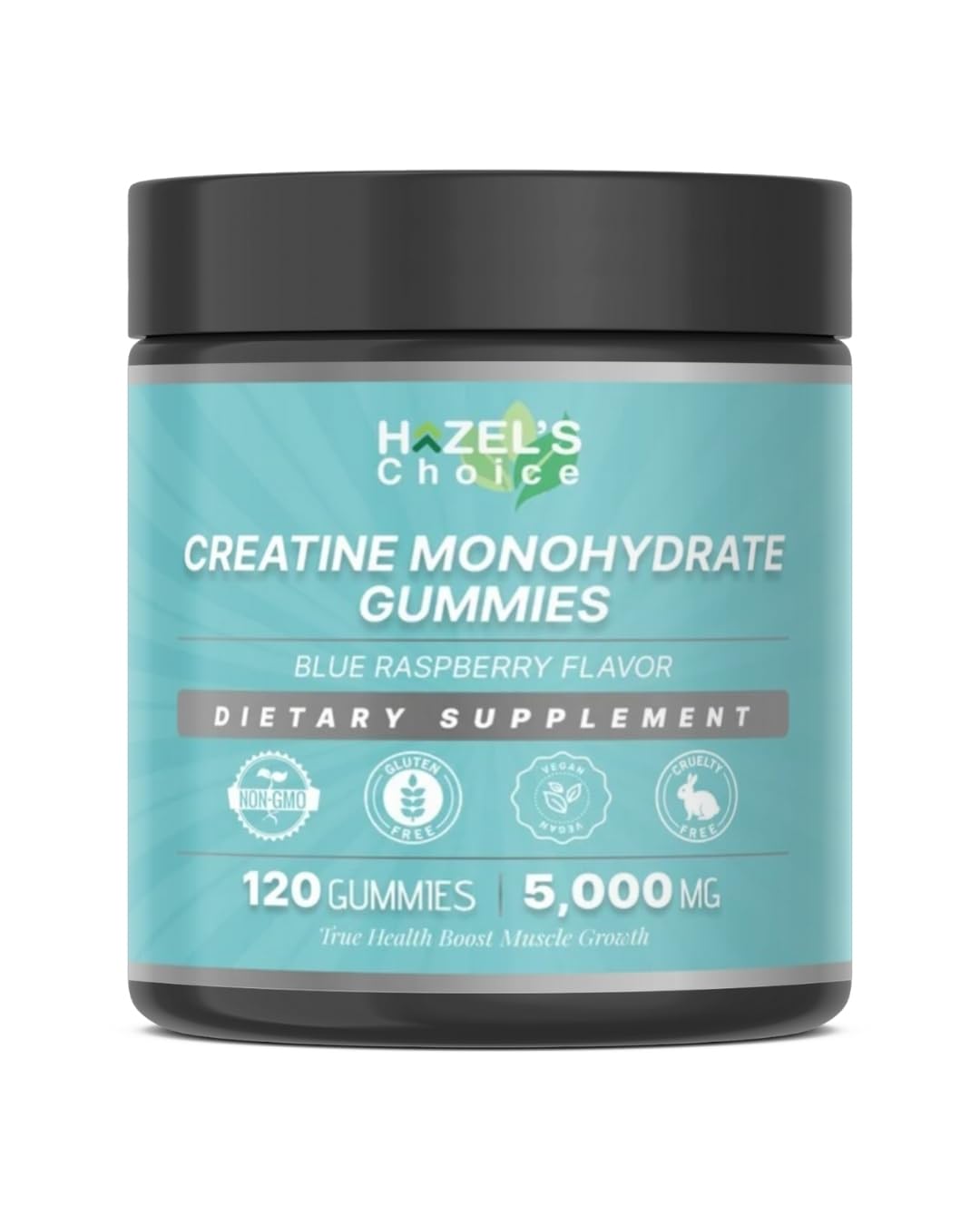 ? Storage Friendly Safety Sealed: These creatine monohydrate gummies for men come in a tamper-evident bottle to ensure safety and freshness. Simply store womens creatine in a cool, dry place—no refrigeration needed—making it easy to keep in your cabinet, desk, or gym bag. Generous Supply in Every Bottle: With 120 gummies per bottle and 30 servings per container, Our vegan creatine offers a consistent addition to your daily wellness habits. Clear labeling and easy usage instructions make it simple to stay on track with your creatine monohydrate flavored gummies. Thoughtfully Formulated Blend: Each serving of our preworkout gummies contains 5000mg creatine monohydrate, along with L-Taurine, Betaine, Alpha GPC, and B12. These creatine chews gummies are carefully selected combination is crafted with attention to detail and ingredient quality. Free from Common Allergens: Hazel's Choice create gummies do not contain soy, peanuts, shellfish, dairy, yeast, wheat, or artificial additives. Our creatine women designed with care, they fit into a variety of dietary needs and preferences without compromise. Vegan Gluten-Free: Our flavored creatine monohydrate gummies are formulated without animal products or gluten, these gummies are suitable for a variety of dietary lifestyles. Hazel's Choice ensures that quality ingredients, including protein with creatine, go into every batch for a clean and inclusive experience. Convenient Gummy Format: Ditch the shaker bottles—just chew and go! Hazel's Choice flavored creatine gummies are easy to take on the move. No mixing, no mess, and no water needed—simply chew four creatine gummy supplements daily, as directed by your healthcare professional. Tasty Dual Flavors: Enjoy the delightful taste of Strawberry and Blue Raspberry in every serving. These energy gummies are a fun and flavorful way to incorporate creatine into your daily routine, offering a burst of fruity freshness without any chalky powders or hard-to-swallow pills. Perfect as pre-workout gummies for an extra boost before your exercise!.