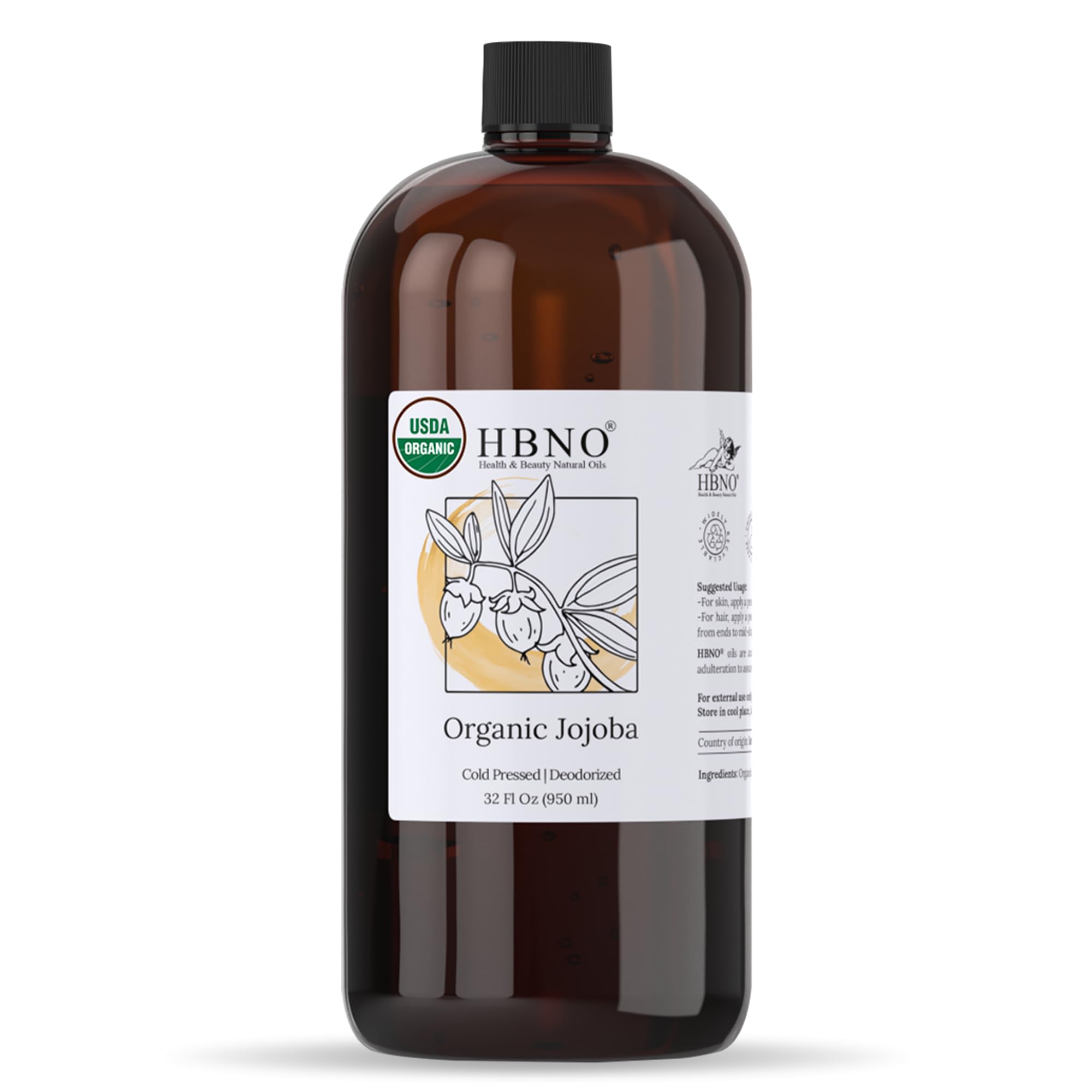 HBNO Organic Jojoba Oil - 32 oz (950ml) Value Size - Ideal for Shampoos Conditioners Massage Blends Face wash Lotions and Skin Care Products. Organic Jojoba 32 Fl Oz (Pack of 1)