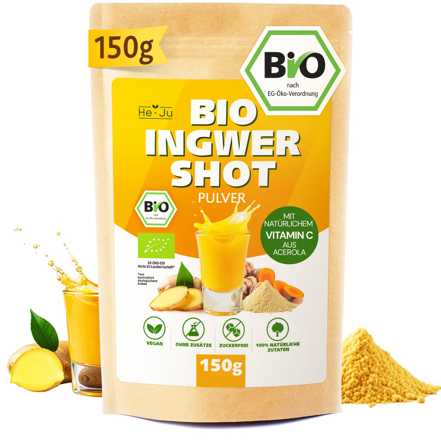 WITH NATURAL VITAMIN C: Our organic ginger powder contains acerola, a natural source of vitamin C. Vitamin C contributes to the normal function of the immune system – perfect for your daily energy boost. 100 ORGANIC: A POWERFUL POWER FROM 6 INGREDIENTS: Made with 64 organic ginger, turmeric, mango, cinnamon, chili pepper, and black pepper – all organically grown. A balanced blend of tangy, fruity, and spicy flavors for a natural energy boost. ? LAB TESTED SAFE: Each batch is tested to ensure optimal quality, purity, and vitamin C content. PRECISE DOSAGE: 2g of powder (½ teaspoon) per serving – the perfect amount for your daily dose. Measure and enjoy! DIRECTIONS FOR USE: For best results, mix the powder with 80 ml of water or juice and shake vigorously in a screw-top jar or shaker. This ensures a perfect mix. ? AUTHENTIC ORGANIC QUALITY: Thanks to the use of natural and organic spices, the powder does not dissolve completely. Slight residue is a sign of quality and authenticity. SUSTAINABLE AND FAIR: Bottled in Germany in collaboration with social enterprises. Packaged in a recyclable, aluminum-free Doypack – a guarantee of quality and responsibility towards people and the environment. GERMAN STARTUP: Developed and produced by an innovative German startup specializing in high-quality vegan food supplements.He-Ju Bio Ginger Shot en poudre 150 g (75 shots) avec vitamine C naturelle issue de l'acérola, extra fort, végétalien, sans additifs, testé en laboratoire, sans sucre, ingrédients 100 naturelsDESCRIPTION DU PRODUIT À LA VITAMINE C NATURELLE : Notre poudre de gingembre bio contient de l'acérola, source naturelle de vitamine C. La vitamine C contribue au fonctionnement normal du système immunitaire – idéal pour votre dose quotidienne d'énergie. 100 BIO : UNE FORCE ÉNERGISANTE GRÂCE À 6 INGRÉDIENTS : Composée à 64 de gingembre bio, de curcuma, de mangue, de cannelle, de piment et de poivre – tous issus de l'agriculture biologique. Un mélange équilibré de saveurs piquantes, fruitées et épicées pour un regain d'énergie naturel. ? TESTÉ EN LABORATOIRE ET SÛR : Chaque lot est testé afin de garantir une qualité, une pureté et une teneur en vitamine C optimales. DOSAGE PRÉCIS : 2 g de poudre (½ cuillère à café) par portion – la dose idéale pour votre dose quotidienne. Mesurez et savourez ! CONSEILS D'UTILISATION : Pour un résultat optimal, mélangez la poudre à 80 ml d'eau ou de jus et agitez vigoureusement dans un bocal à couvercle vissé ou un shaker. Ceci garantit un mélange parfait. ? QUALITÉ BIOLOGIQUE AUTHENTIQUE : Grâce à l'utilisation d'épices naturelles et biologiques, la poudre ne se dissout pas complètement. De légers résidus sont un gage de qualité et d'authenticité. DURABLE ET ÉQUITABLE : Mis en bouteille en Allemagne en collaboration avec des ateliers sociaux. Conditionné dans un Doypack recyclable et sans aluminium – gage de qualité et de responsabilité envers les personnes et l'environnement. STARTUP ALLEMANDE : Développé et produit par une start-up allemande innovante, spécialisée dans les compléments alimentaires vegan de haute qualité.