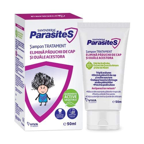 Ingredients No insecticides, contains only 3 vegetable essences: Andiroba Oil, Extract of Quassia, Amara. Description The SANTADERM ParasiteS Lice Treatment Shampoo is clinically tested and proved an effective treatment against head lice and their eggs. It removes and destroys living forms, lice eggs and prevents pediculosis. The SANTADERM ParasiteS Lice Treatment Shampoo does not contain chemical insecticides, so head lice cannot develop resistance to its ingredients. The SANTADERM ParasiteS Lice Treatment Shampoo can be used to treat pediculosis and to prevent lice and nits infestation. Usage * Apply on washed hair; check at the root of the hair, ears and behind your neck. * Leave the shampoo for 10-15 minutes, then rinse it off with water. * To optimize the treatment, comb your hair while still wet with a regular comb, then strand by strand use a special comb (available for free with the 150 ml shampoo) * Separate each strand as thin as possible so that the scalp becomes visible. * Using the comb, remove all the lice and/or nits that you find. * Always comb the hair from the root to the top, taking care of the areas indicated above. Repeat treatment after 3-4 days even for prevention. * There is no risk in repeating the treatment several times. Packing 50 ml Tube INDICATIONS pediculosis INGREDIENTS AQUA, SODIUM LAURETH SULFATE, DECYL GLUCOSIDE, DISODIUM COCOAMPHODIACETATE, PROPYLENE GLYCOL, QUASSIA AMARA WOOD EXTRACT, MELIA AZADIRACHTA SEED OIL, CARAPA GUIANENSIS SEED OIL, XANTHAN GUM, MELALEUCA ALTERNIFOLIA LEAF OIL, PEG-150 DISTEARATE, TETRASODIUM EDTA, CHLORHEXIDINE DIGLUCONATE, IMIDAZOLIDINYL UREA, POTASSIUM SORBATE, LAVANDULA ANGUSTIFOLIA OIL: LINALOOL DIRECTIONS Apply on washed hair, check at the root of the hair, ears and behind your neck. • Leave it for 10 to 15 minutes. Rinse with water. • For optimum result, comb the hair while still wet with a regular comb, then strand by strand, using a special anti-lice comb (only available with the 150ml shampoo) or other comb with fine teeth. Separate each strand as thin as possible so that the scalp becomes visible. • Using the comb, remove all the lice and/or nits that you find. • Comb from the root to the to SAFETY WARNING Keep out of reach of children! Avoid contact with eyes and mucous membranes! Do not use the product in case of hypersensitivity to any of the ingredients. The product can be used both by adults and children older than three years. See moreKills head lice and eggs, prevents pediculosis.