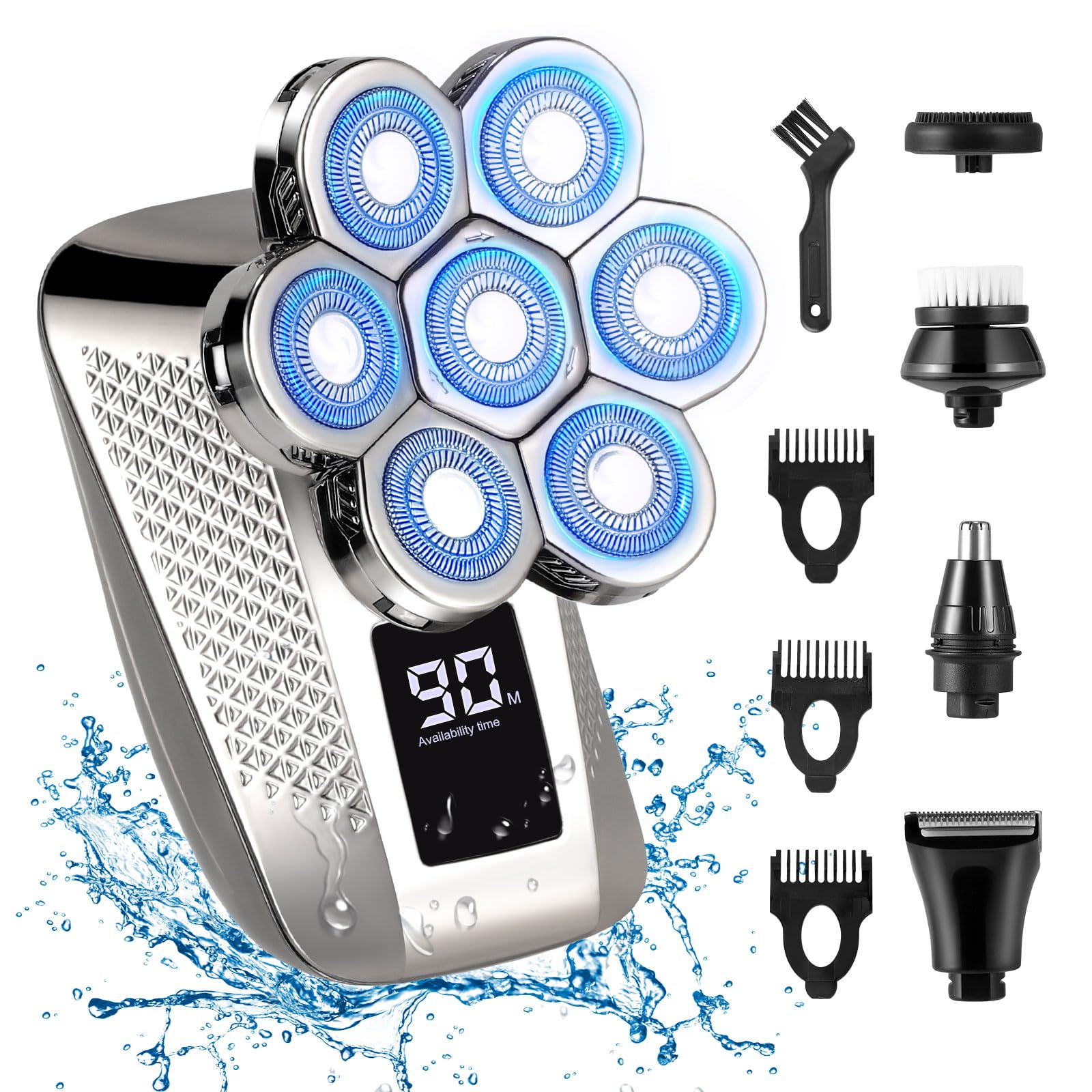 Head Shavers for Men IPX7 Skull Shaver 7D Rechargeable Rotary Shaver 5-in-1 Bald Men's Shaver Electric Razor Grooming Kit with Nose Trimmer and Hairdresser's Scissors