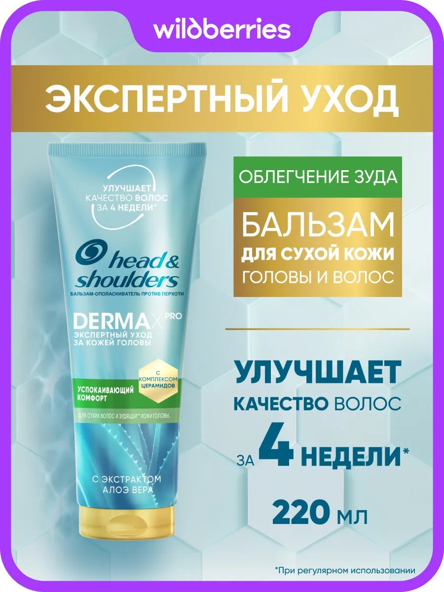 Придайте волосам здоровый вид, питание и предотвращение перхоти** с помощью восстанавливающего бальзама для волос Head &Shoulders DermaXPRO Успокаивающий комфорт. Наша экспертная формула основана на комплексе церамидов, который имитирует натуральные липиды кожи и удерживает клетки вместе, предотвращая потерю влаги. При каждом использовании наш бальзам помогает укрепить волокна волос, предохраняя их от ломкости, придавая им питание и ощущение легкости. При массаже от корней до кончиков и при регулярном использовании этот бальзам-ополаскиватель улучшает качество волос за 4 недели*. Он насыщен экстрактом Алоэ Вера и комплексом церамидов, и разработан специально для сухой зудящей кожи головы и сухих волос. Используйте вместе с шампунем против перхоти Head &Shoulders DermaXPro Успокаивающий комфорт, чтобы предотвратить появление перхоти, сухость и шелушение**, а также сделать волосы красивыми от корней до кончиков. (*При регулярном использовании **Видимая перхоть при регулярном применении).
