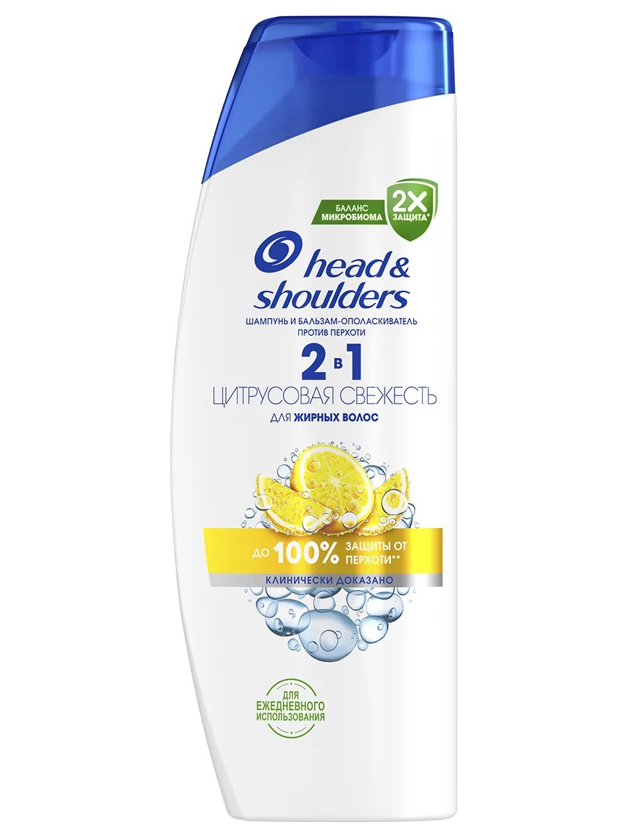 Head&Shoulders Шампунь против перхоти 2в1 Цитрусовая свежесть для жирных волос 400мл. Шампунь и бальзам-ополаскиватель против перхоти Цитрусовая свежесть 2-в-1 эффективно очищает жирные волосы и кожу головы, даря вам ощущение свежести и приятный аромат. Высокоэффективная формула Derma&Pure борется с зудом, жирной и сухой кожей головы, предотвращая появление перхоти. Формула шампуня с цитрусом прекрасно смягчает и глубоко увлажняет волосы, обеспечивая до 100% свободы от перхоти (видимые чешуйки, при регулярном использовании). Дерматологически протестированная, ph-сбалансированная формула с антиоксидантами для мягкого ухода за волосами и кожей головы. Поддерживает красоту волос и обеспечивает до 100% свободы от перхоти (при регулярном использовании). Формула не содержит нежелательных ингредиентов: парабенов, фосфатов, парафинов. Состав: Aqua; Sodium LaurylSulfate; Sodium LaurethSulfate; Glycol Distearate; Zinc Carbonate; SodiumChloride; Sodium Xylenesulfonate; Zinc Pyrithione; Cocamidopropyl Betaine; Dimethicone; Parfum; Menthol; SodiumBenzoate; Guar HydroxypropyltrimoniumChloride; Hydrochloric Acid; SodiumHydroxide; Magnesium CarbonateHydroxide; Hexyl Cinnamal; CitrusLimonFruit Extract; Limonene; Benzyl Salicylate; Magnesium Nitrate; Citronellol; SodiumPolynaphthalenesulfonate; CI19140; Methylchloroisothiazolinone; MagnesiumChloride; Methylisothiazolinone; CI 42090