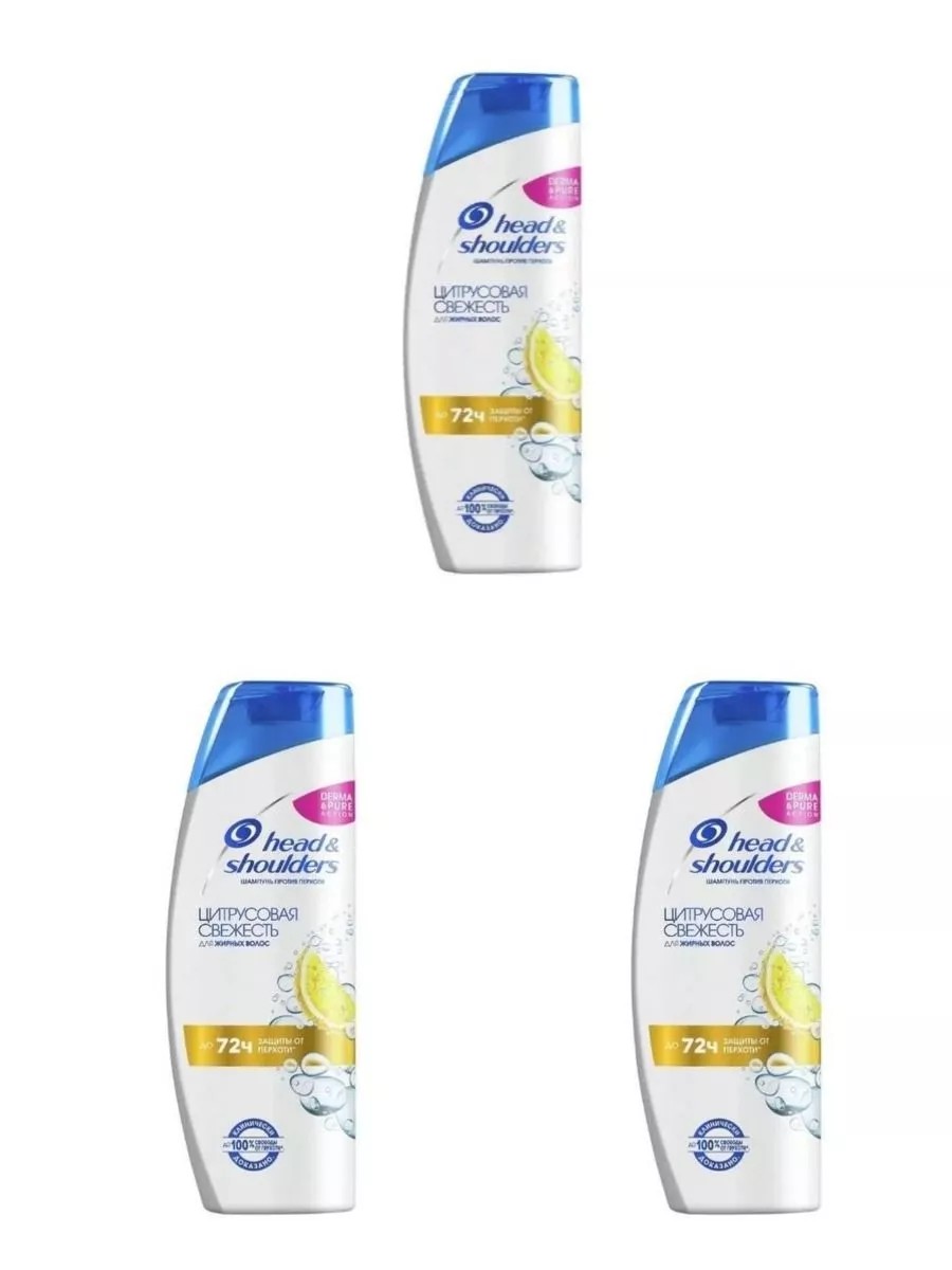 Head & Shoulders,Шампунь для волос,Цитрусовая Свежесть 200 мл, 3 шт. Шампунь против перхоти Head & Shoulders (Хед энд Шолдерс) Цитрусовая Свежесть с экстрактом лимона предназначен для жирных волос и кожи головы. Он эффективно очищает жирные волосы и кожу головы, придавая волосам приятный цитрусовый аромат. Шампунь содержит активные действующие вещества - пиритион цинка и карбонат цинка - благодаря которым он обеспечивает до 100% свободы от перхоти. Его усовершенствованная формула Derma & Pure протестирована дерматологами, pH-сбалансирована, усилена антиоксидантами для бережного ухода за волосами и кожей головы. Не содержит парабенов, фосфатов и парафинов. Head&Shoulders - бренд шампуней № 1 в мире, который также заботится о планете: флакон на 40% состоит из переработанного пластика (за исключением крышки и этикетки) и пригоден для переработки.