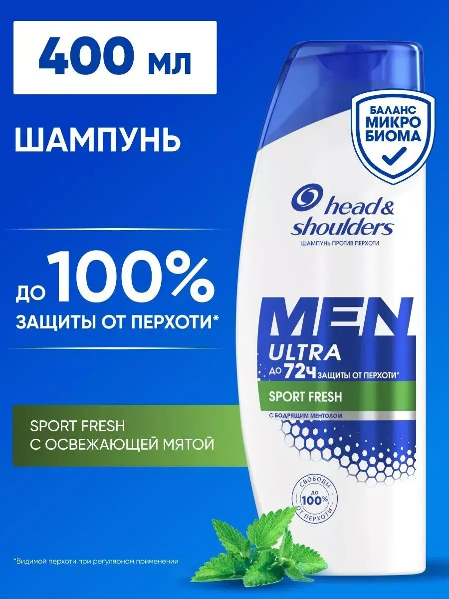 Шампунь против перхоти и бальзам для мужчин Head & Shoulders (Хэд энд Шолдерс) Men Ultra Sport Fresh с экстрактом перечной мяты ухаживает за волосами и кожей головы, полностью оправдывая ожидания даже самых требовательных мужчин. Он очищает кожу головы и волосы, придавая приятный мятный аромат и обеспечивая защиту от шелушения, зуда и сухости на срок до 72 часов*. Эффективен даже против стойкой перхоти. Технология шампуня для волос Head & Shoulders Ultra для мужчин обеспечивает клинически доказанную защиту от перхоти до 100% (при регулярном использовании). Обновленная формула с активным ингредиентом Пироктон Оламином удаляет как видимую, так и невидимую перхоть, доставляя в поры в 2Х больше защитных ингредиентов. Формула Микробиомного Баланса эффективно борется с перхотью и предотвращает ее повторное появление. Кожа головы защищена от сухости и жирности, волосы чистые и крепкие. Формула с увлажняющими веществами избавляет волосы от перхоти, прекрасно очищает кожу головы и делает волосы послушными. Разработано специально для мужчин, идеально для ежедневного использования. Способ применения: Нанесите шампунь на волосы. Вспеньте, затем смойте водой. Шампунь подходит для сухой кожи головы и жирной кожи головы. *видимая перхоть, при регулярном использовании