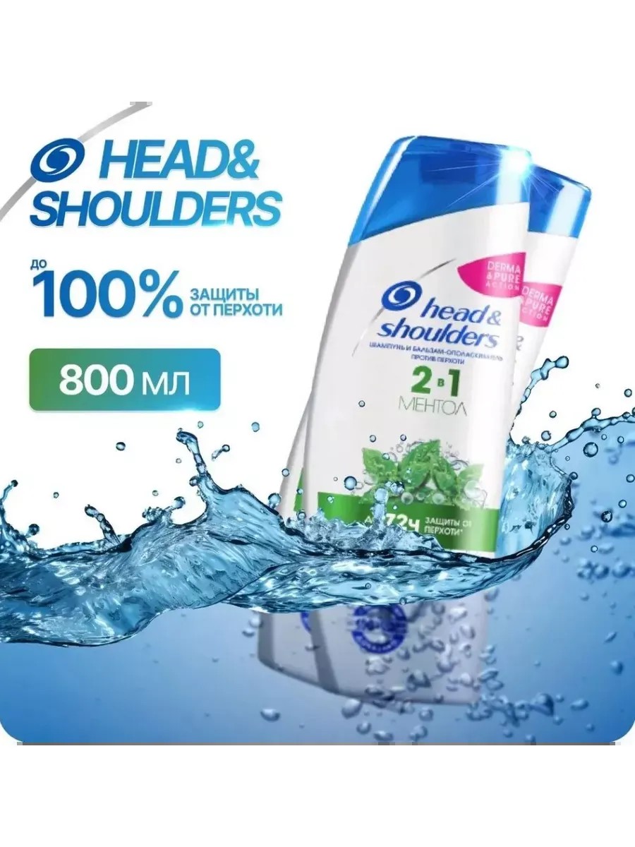Шампунь и бальзам-ополаскиватель против перхоти Head & Shoulders Ментол 2в1 800мл, бережно ухаживает за волосами и кожей головы. Это средство от перхоти 2 в 1 эффективно очищает кожу головы и волосы, увлажняя их и придавая им ментоловую свежесть. Шампунь и бальзам-ополаскиватель 2в1 содержит активные действующие вещества — пиритион цинка и карбонат цинка — благодаря которым он обеспечивает до 100% свободы от перхоти. Его усовершенствованная формула Derma & Pure протестирована дерматологами, pH-сбалансирована, усилена антиоксидантами и не содержит парабенов, фосфатов и парафинов.
