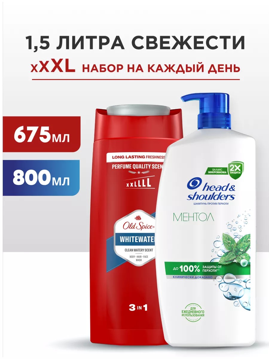 Набор в XXL формате – 1 литр свежести на максимум! Выгодный объем с удобной помпой (дозатором). Набор от Head & Shoulders (Хед энд Шолдерс) и Old Spice (Олд Спайс) - всё, что нужно для ухода за волосами, кожей головы и телом. Мужской шампунь и бальзам-ополаскиватель от перхоти Head & Shoulders Ментол 2в1 900мл бережно очищает кожу головы и волосы, увлажняя их и придавая им ощущение свежести. 2в1 Шампунь и бальзам-ополаскиватель с ментолом содержит активные действующие вещества - пиритион цинка и карбонат цинка - благодаря которым он обеспечивает до 100% свободы от перхоти*. Его усовершенствованная формула Derma & Pure протестирована дерматологами, pH-сбалансирована, усилена антиоксидантами и не содержит парабенов, фосфатов и парафинов. Мужской гель для душа 3в1 Old Spice (Олд Спайс) Whitewater 675 мл обладает наисвежайшим ароматом. Динамичный аромат парфюмированного геля для душа Old Spice (ОлдСпайс) с яркими нотами лимона защитит тебя от неприятного запаха на весь день. Обеспечивает до 68 дней свежести. Ароматизированный гель для душа 3 в 1 мужской. Подходит для ежедневного использования. Ощущение свежести и чистоты на каждый день – с Head & Shoulders и Old Spice! *Видимой перхоти при регулярном применении.