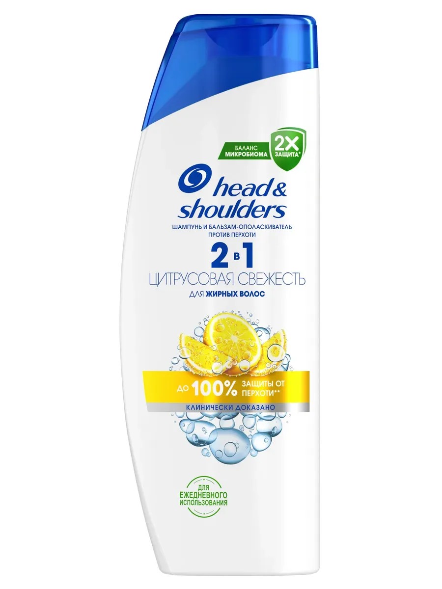 Head&Shoulders, шампунь и бальзам-ополаскиватель, против перхоти, цитрусовая свежесть, 400 мл,1 шт. Шампунь и бальзам-ополаскиватель против перхоти Head & Shoulders Цитрусовая Свежесть с экстрактом лимона предназначен для жирных волос и кожи головы. Это средство от перхоти 2в1 эффективно очищает жирные волосы и кожу головы, придавая волосам приятный цитрусовый аромат. 2в1 Шампунь и бальзам-ополаскиватель содержит активные действующие вещества — пиритион цинка и карбонат цинка — благодаря которым он обеспечивает до 100% свободы от перхоти. Его усовершенствованная формула Derma & Pure протестирована дерматологами, pH-сбалансирована, усилена антиоксидантами и не содержит парабенов, фосфатов и парафинов. Видимой перхоти при регулярном применении.