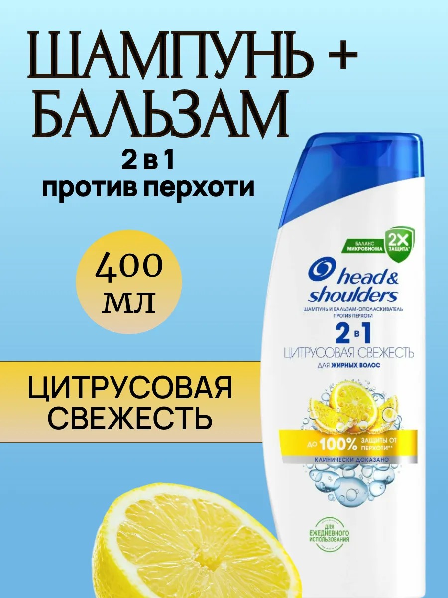 Шампунь и бальзам-ополаскиватель 2в1 Head & Shoulders против перхоти Цитрусовая Свежесть 400 мл. 2в1 Шампунь и бальзам-ополаскиватель против перхоти Head & Shoulders Цитрусовая Свежесть с экстрактом лимона предназначен для жирных волос и кожи головы. Это средство от перхоти 2в1 эффективно очищает жирные волосы и кожу головы, придавая волосам приятный цитрусовый аромат. 2в1 Шампунь и бальзам-ополаскиватель содержит активные действующие вещества — пиритион цинка и карбонат цинка — благодаря которым он обеспечивает до 100% свободы от перхоти*. Его усовершенствованная формула Derma & Pure протестирована дерматологами, pH-сбалансирована, усилена антиоксидантами и не содержит парабенов, фосфатов и парафинов. *Видимой перхоти при регулярном применении.